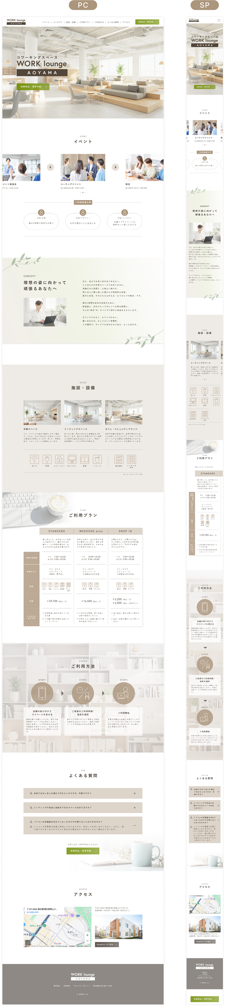 SHElikes PROデザイナーの課題にて、会員専用コワーキングスペースのLPを制作。 ヒアリング動画をもとに要件定義を行い、クライアント提供のPCワイヤーフレームをもとに情報整理・再設計を実施。PC / SPのデザインカンプをFigmaで制作。 制作時間:30時間