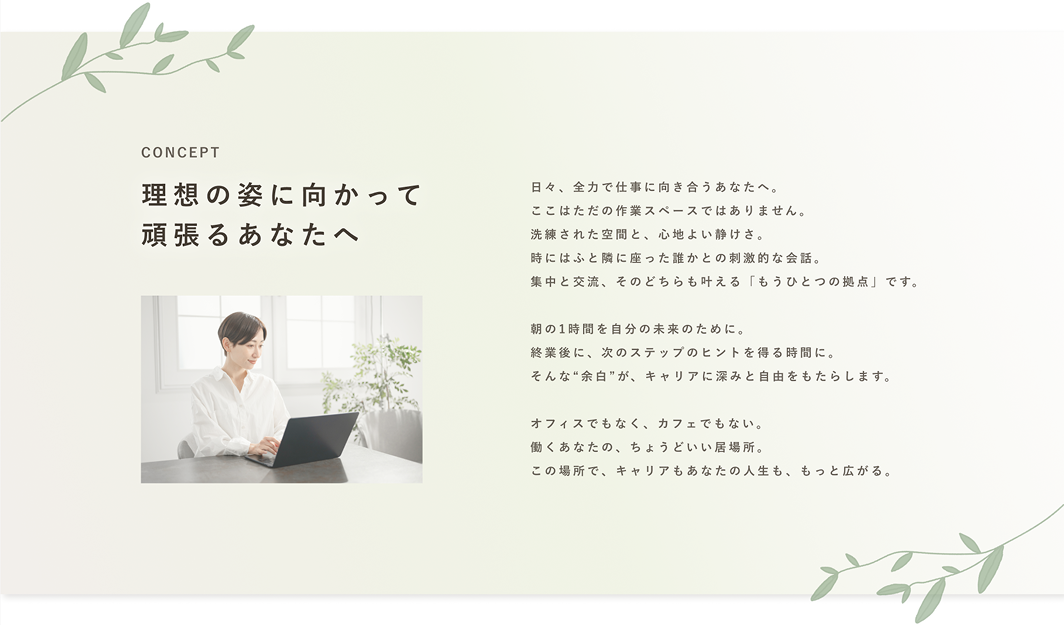 - 事業のひとつに都内で働くビジネスパーソン向けのコワーキングオフィスを運営。