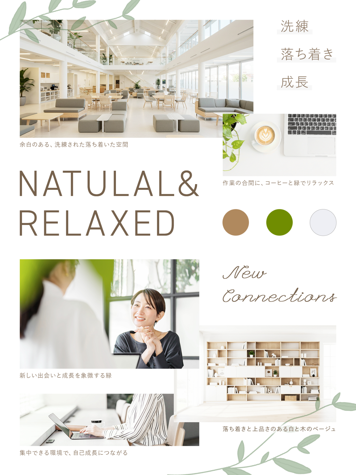 - アクセントに緑を加え、出会いや自己成長、リラックス感を表現。