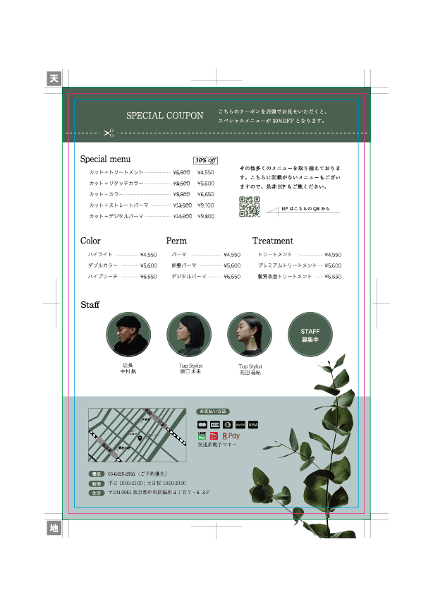 - 美容室の雰囲気が伝わるような洗練されたデザインにするため、植物の画像を挿入したり、色を使いすぎないようにしました。