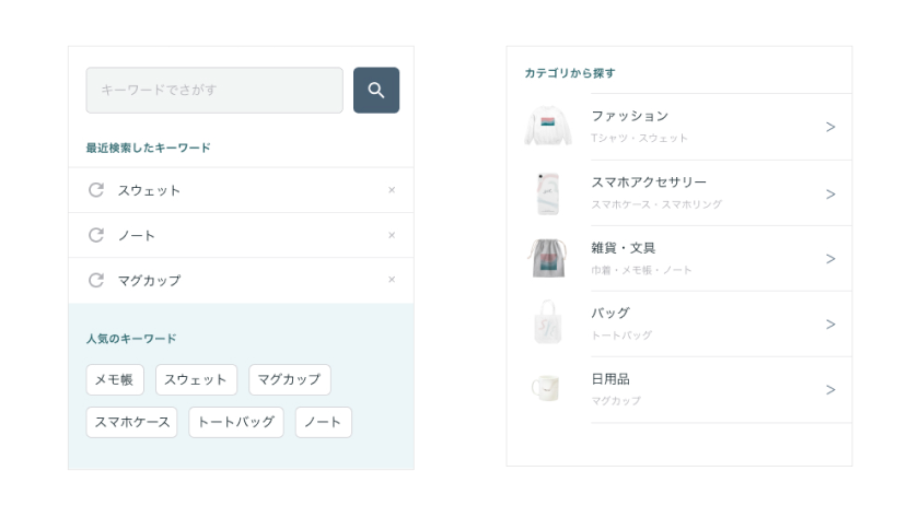 具体的に欲しい商品がなく、キーワード検索ができない場合も考えられるため、あらかじめ「人気のキーワード」や「カテゴリから探す」を用意し、検索という動作に繋げる。