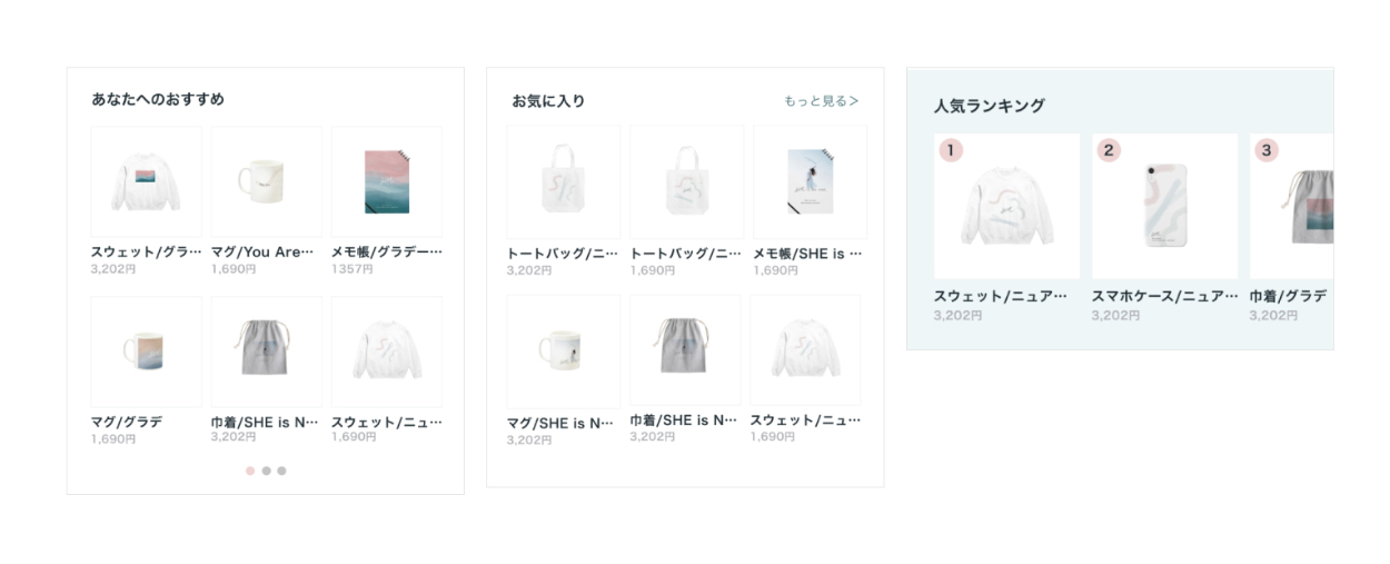 ホーム画面におすすめやお気に入り、人気ランキングといったユーザーが購入してくれる可能性の高い商品の情報を載せ、購入への導線とする。画面遷移の煩わしさにより、ユーザーがECサイトから離脱することが考えられるので、商品の購入に繋がる情報はホーム画面に載せることとした。