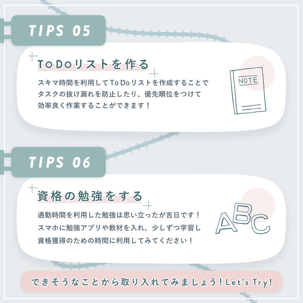 - すぐにでも始められることを6つ、小見出し(行動)+太字強調文(行動によってどうなるか)を制作しました。
