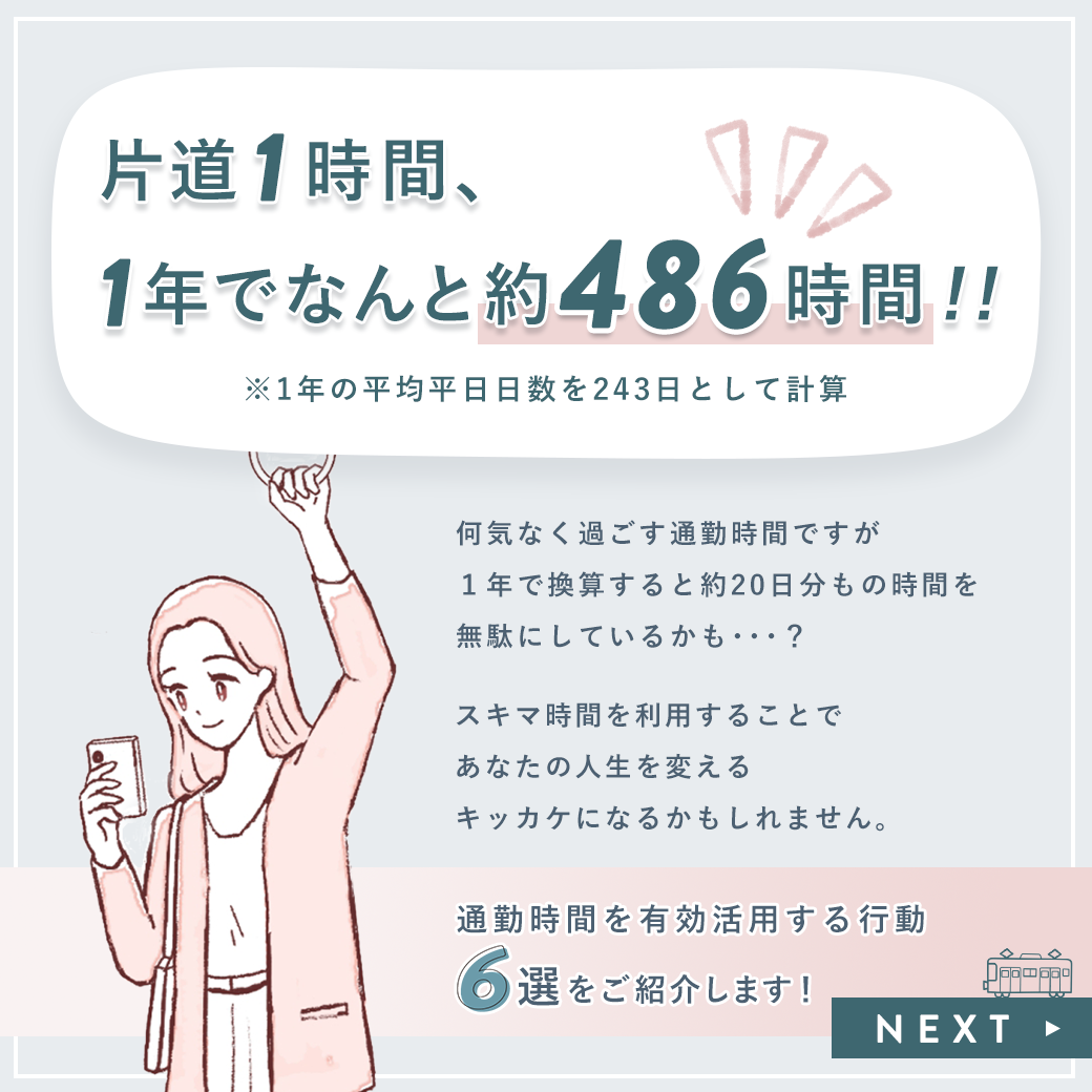 - 電車orバスの通勤時間にスマホばかりなんとなく見てしまっているが、有効活用できないかと考えている女性