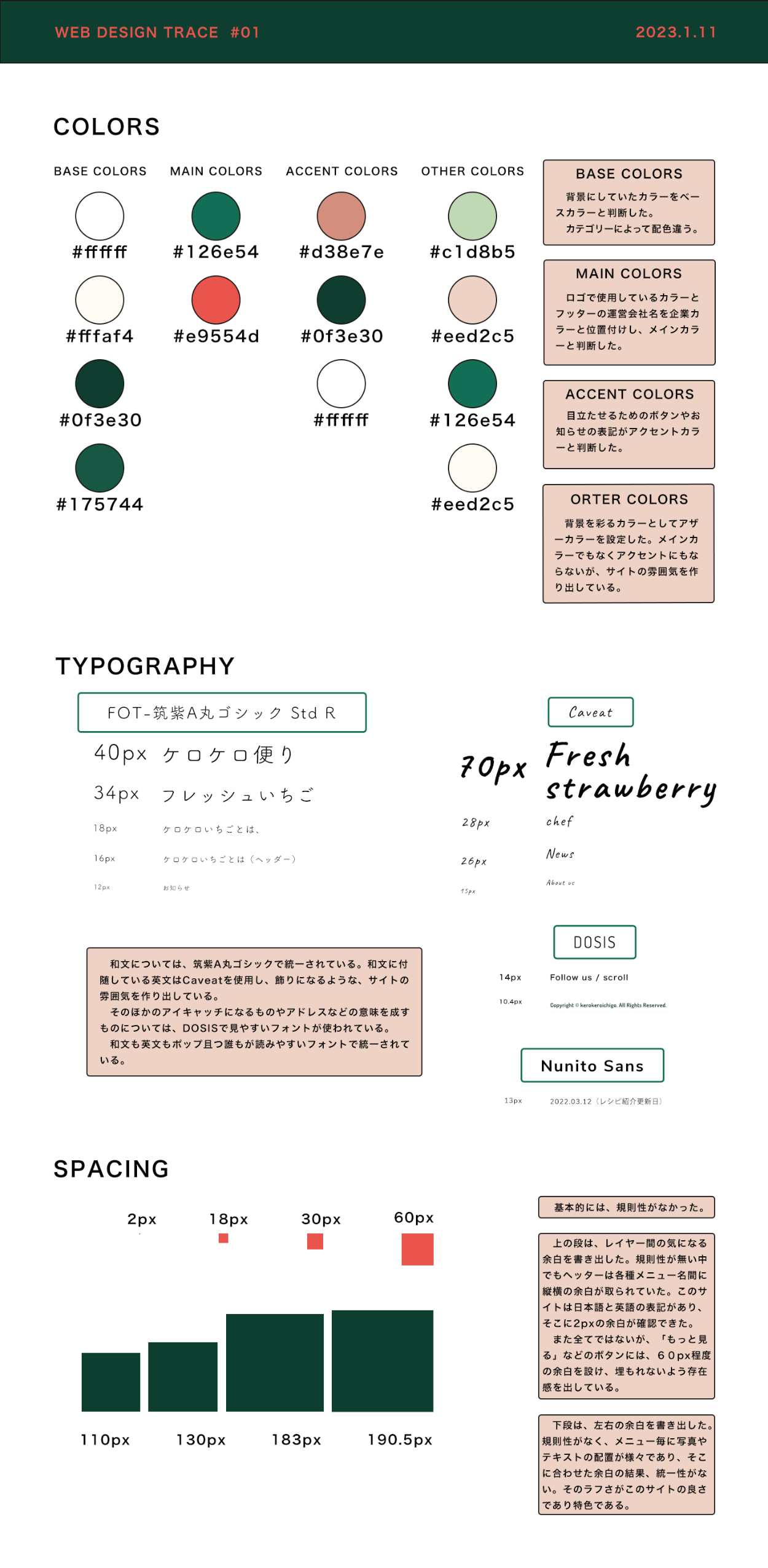 今回トレースしたサイトは、学んできた余白の統一感があまりなく、ニュアンス感を大事にしている雰囲気を感じとりました。基本的には、まずはすべてのスタイルについては統一感を持たせることが大事ではありますが、クライアントの大切にしている部分も読み取り、時にはイレギュラーな表現もできるデザイナーになりたいと思いました。