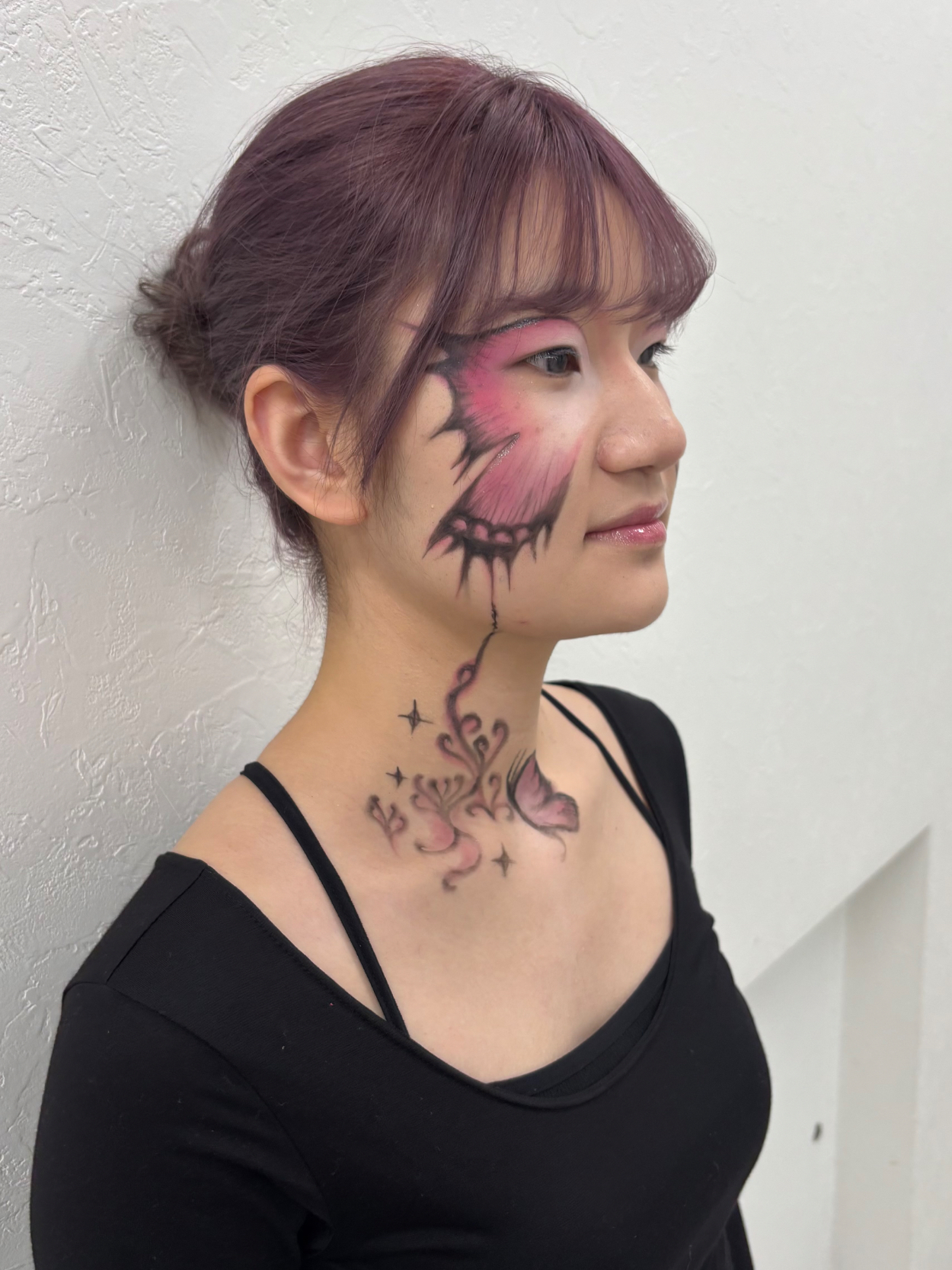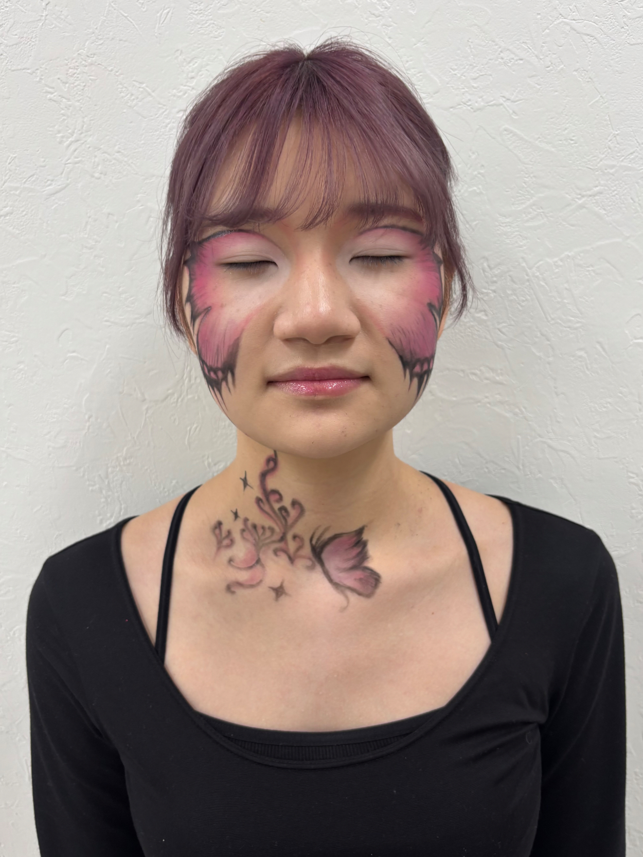 ボディーペイント イイダ 専門学生 【蝶モチーフのボディーペイント】左右非対称の羽を意識し、繊細なラインで構成しました。カラーグラデーションを丁寧に重ね、蝶特有の幻想的な印象を出せるよう、頑張りました。