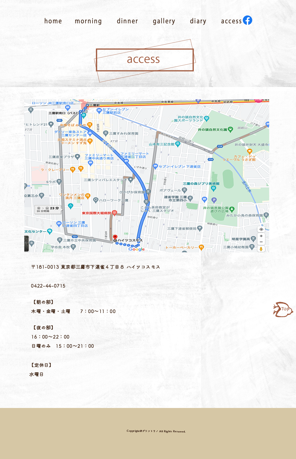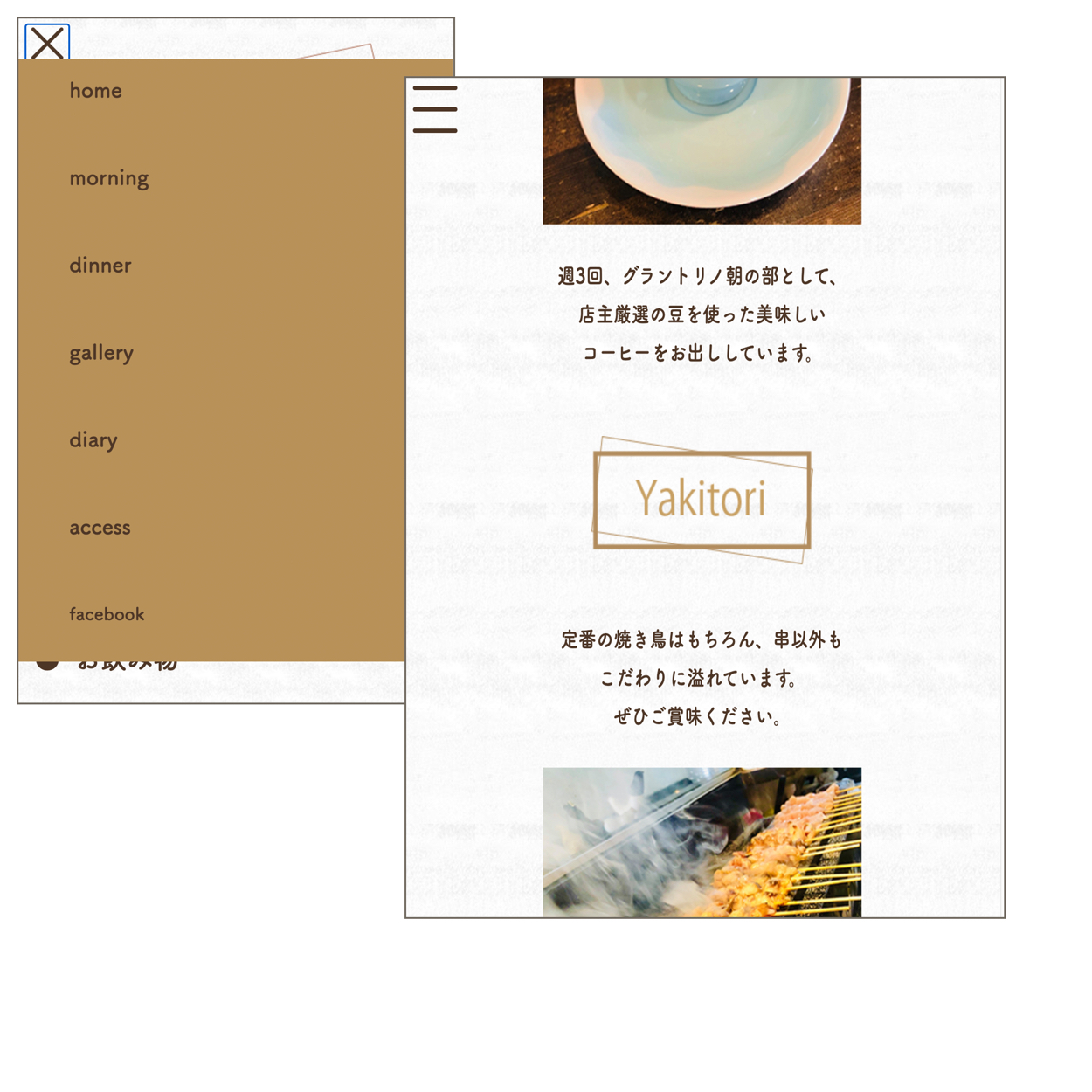 - TOPページ:サイトにアクセス時に、お店のロゴと店舗の外観の写真を全画面にフェードインフェードアウトの動きをつけ、見た人に印象付ける演出をした。また、モーニング部門とディナー部門があるため、分かりやすく短い文書で説明している。