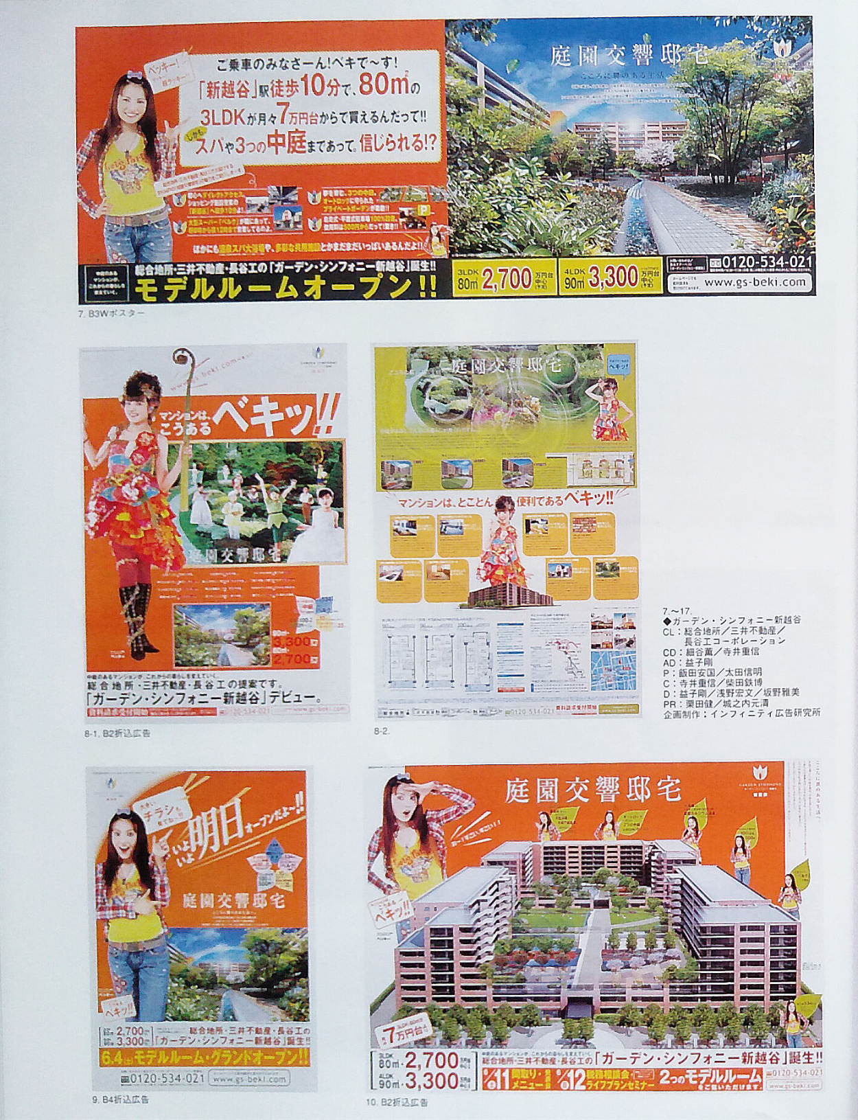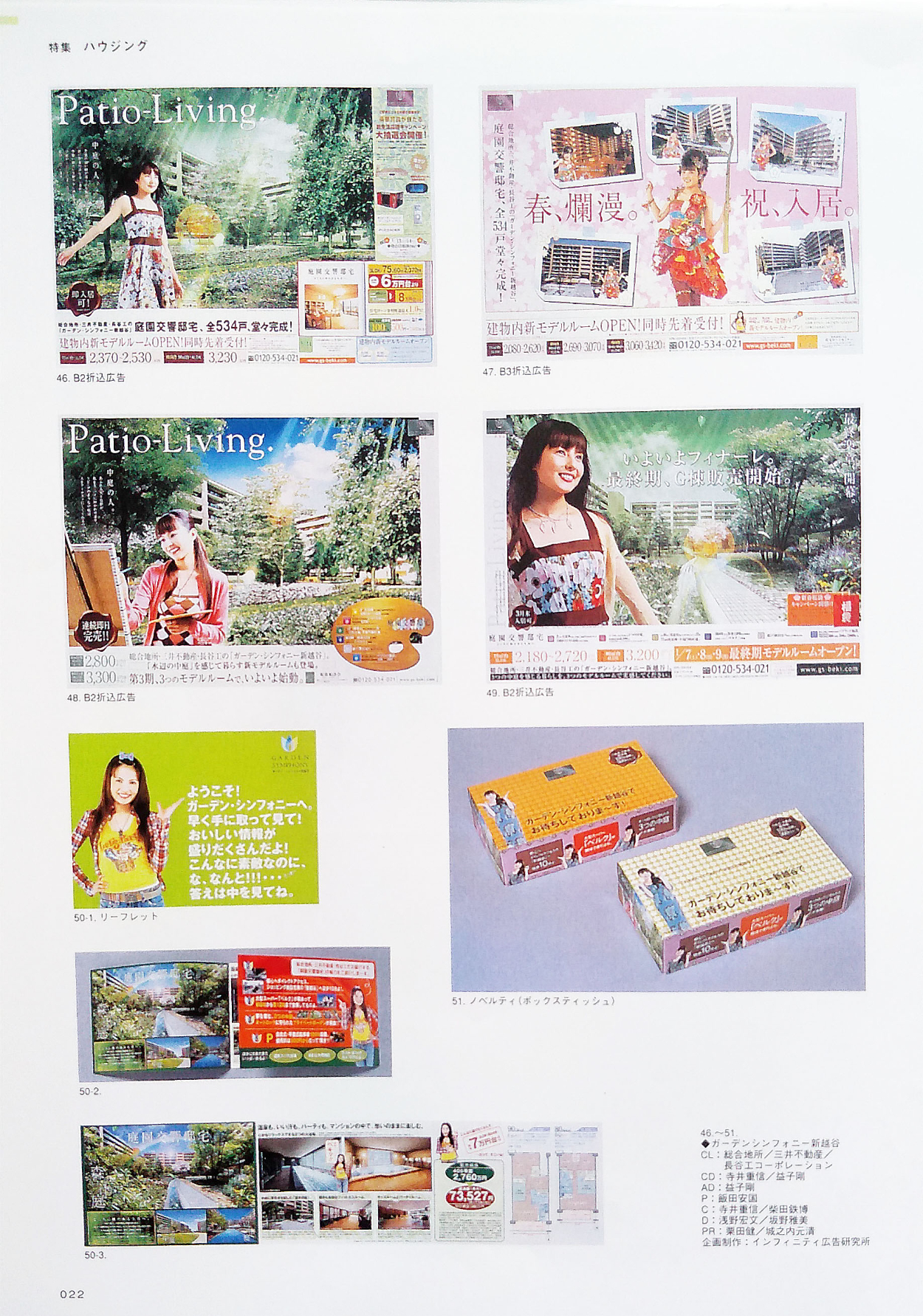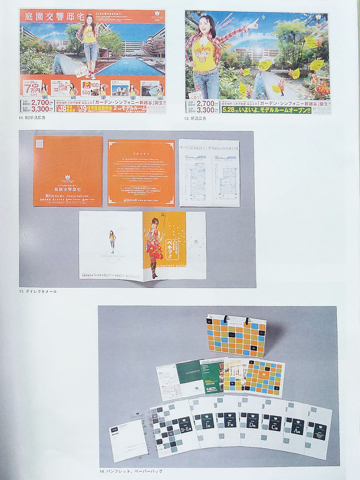 契約が1年だったためにその間にできることは限られていたため(撮影も1日で1年分の衣装などまとめて4~5パターン撮影など)かなりのスピード感が求められた案件でした。マンションのSPツールは地味なものや固めのデザインが多かったため、鮮やかなデザインはクライアント、顧客双方から評価が高く、大規模案件だったにもかかわらず早期完売に繋がり、不動産・広告グラフィックスという大冊にも掲載されました。