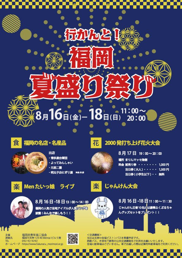 福岡市の景色をパスで作成して配置することと、大川組子の模様をデザインに入れることで福岡を全面的にアピールし福岡県内だけでなく県外の方にも興味を持ってもらえるデザインにした。写真と文字は整列させ間隔を等しく開けることで視覚的にまとまった情報として受け入れられるように工夫した。