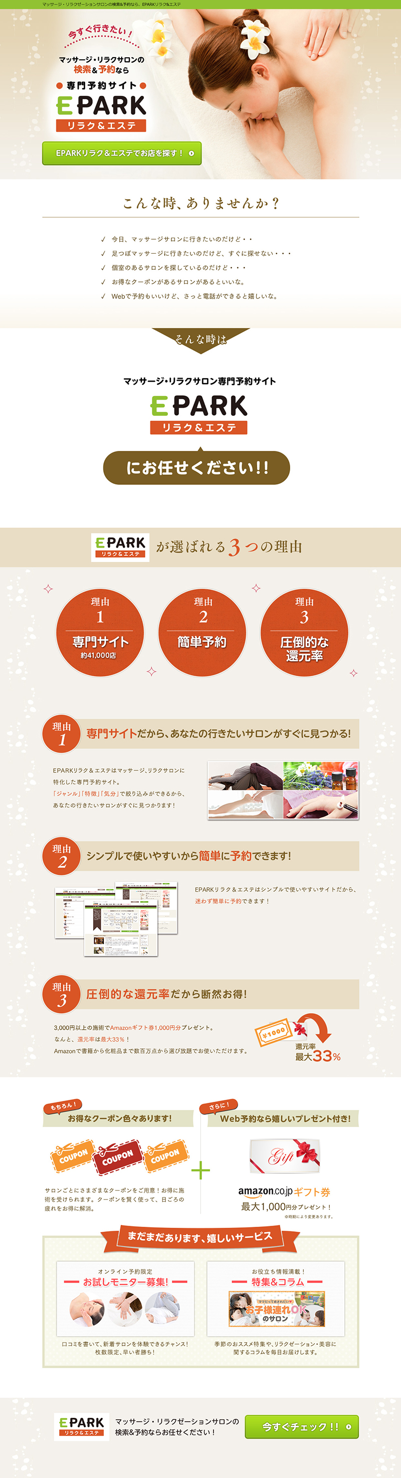 LPデザインとバナーデザイン HANAKO T フリーランスWebデザイナー OVERVIEW EPARK リラク&エステLPデザイン YEAR 2014 バナーとLPページをデザインさせてもらいました。▼バナー類