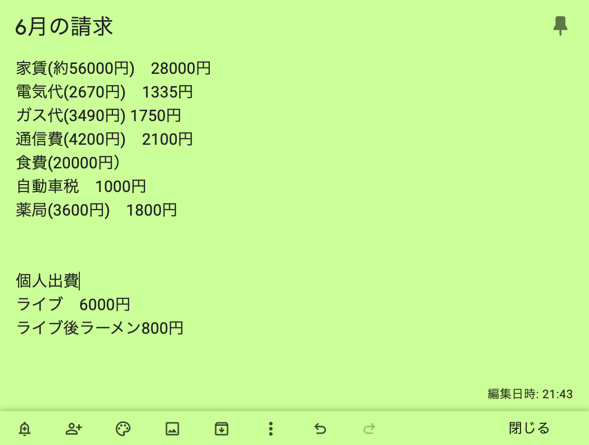 夫婦で生活費を完全折半にしていますが、今までGoogleKeepで毎月手で入力してそれを電卓でたたいて金額を出していました。