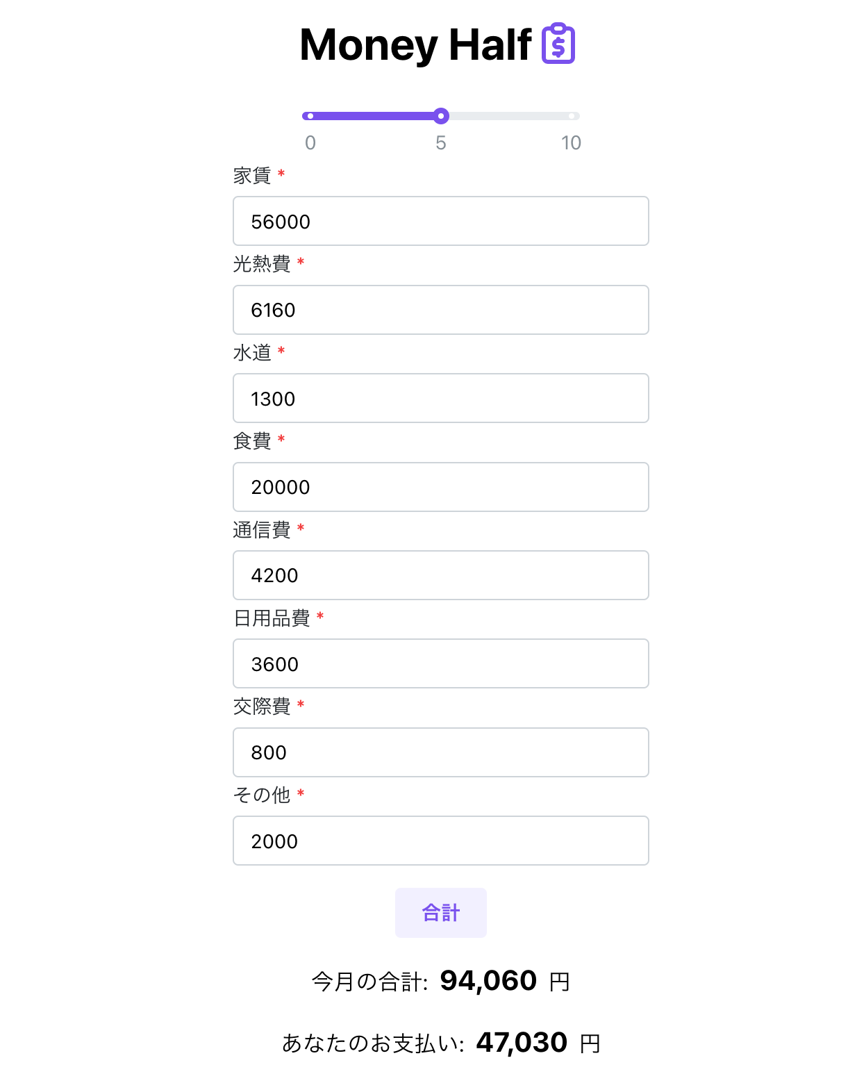 夫婦や恋人同士で使用するのが前提なので、生活費を好きな割合負担に自由に変更できるようにしました。