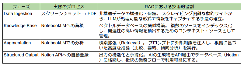 インプットの自動化により、分析フェーズ(NotebookLM)への迅速な移行と、最終的なNotionでのナレッジ共有の完全自動化を目指す。