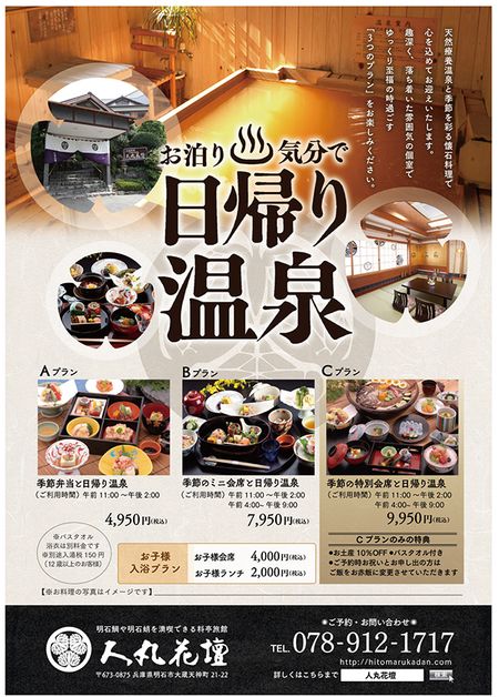 料理と温泉の写真を上から置きたいと考えていたが、枠をつけて配置すると写真の上でも割と馴染むことを知った。