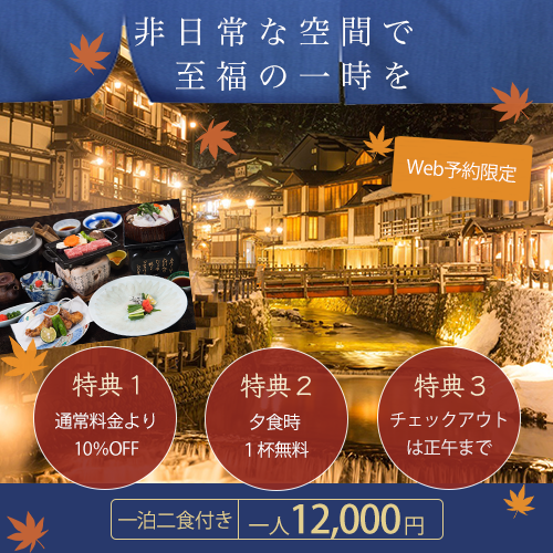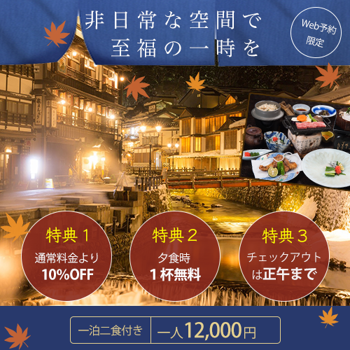 三つの特典:下記通常料金より10%オフ、夕食時1ドリンク無料、遅めのチェックアウト可能〜12:00まで