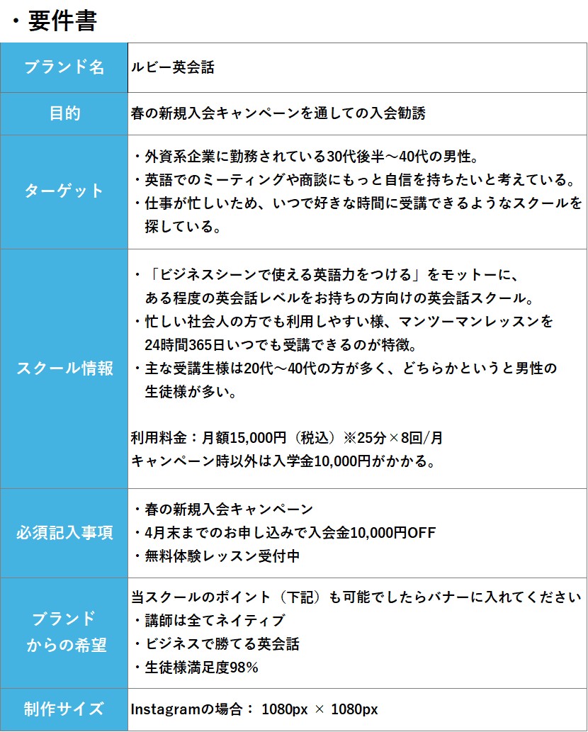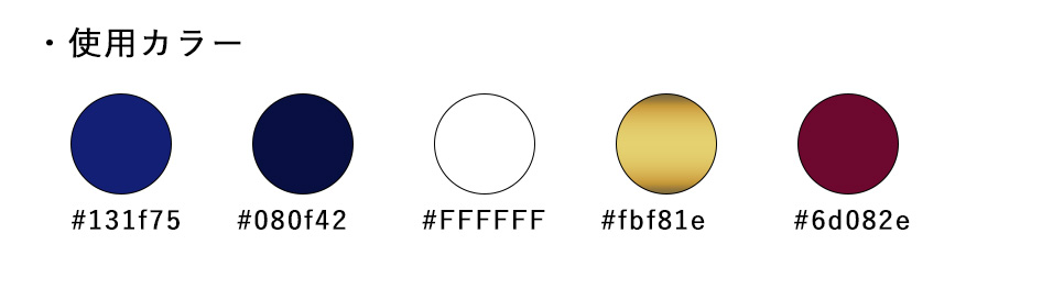 今回のターゲット層が30代後半~40代の男性であるため、落ち着いた印象を与える配色を目指した。また社会人向けのスクールであるため、ビジネスライクな印象を与えるブルー系統のカラーを中心に配色した。アクセントには金色を使用し、高級感をプラスした。