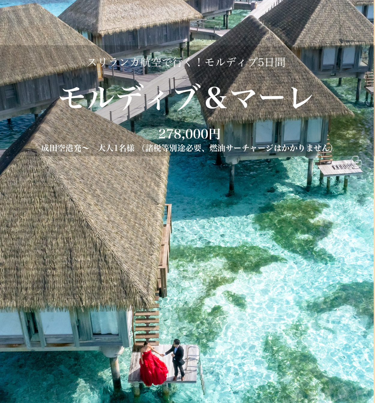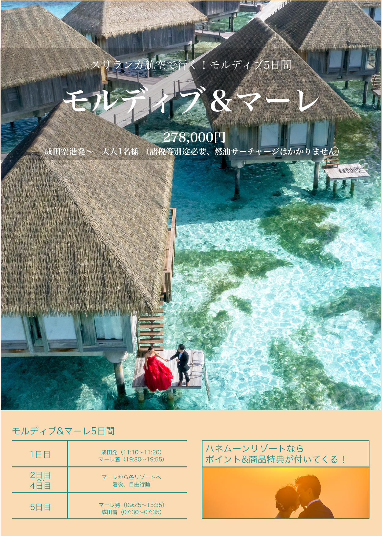 余白多く設定して、モルディブのイメージを文字で消さないようにイメージを出すよう心がけました。掲載する情報にはメリハリをつけ、題名→料金→その他情報とコンパクトにまとめ、文字同士もゆとりを持たせました。