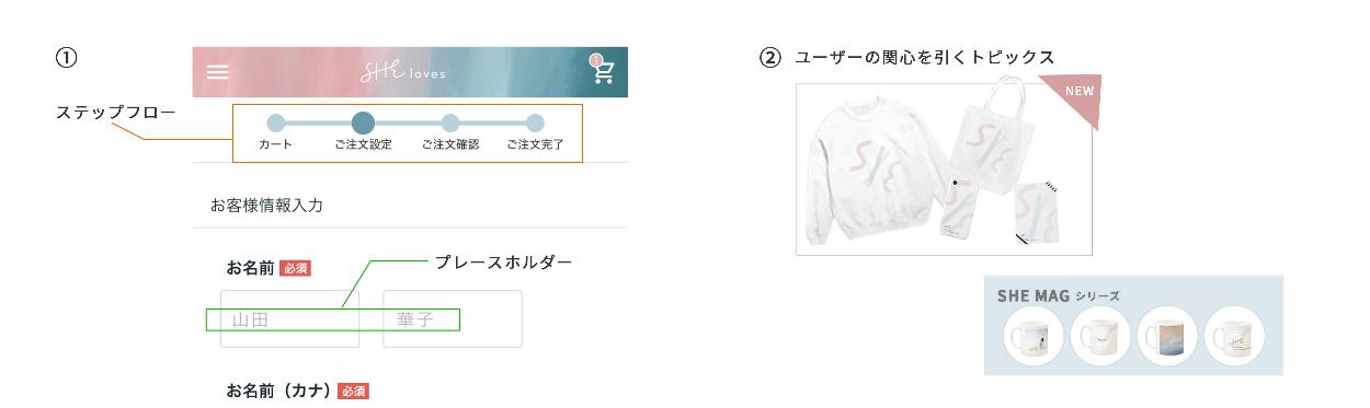 SHE株式会社が展開する架空のECサイト(SHE loves)が抱える2つの課題をUI/UXデザインで解決する。