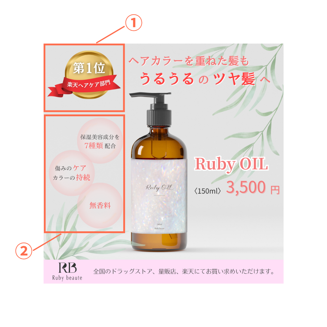 ① 楽天ヘアケア部門1位という内容をを強調させたかったので、色も他とは違い、少しはっきりするような色を選択し、Z型の左上に配置しました。