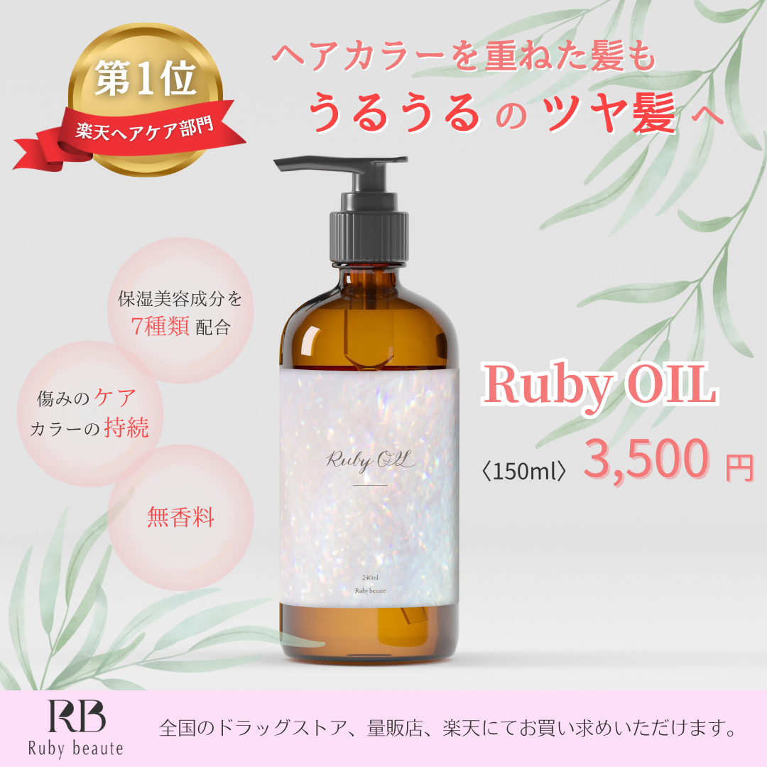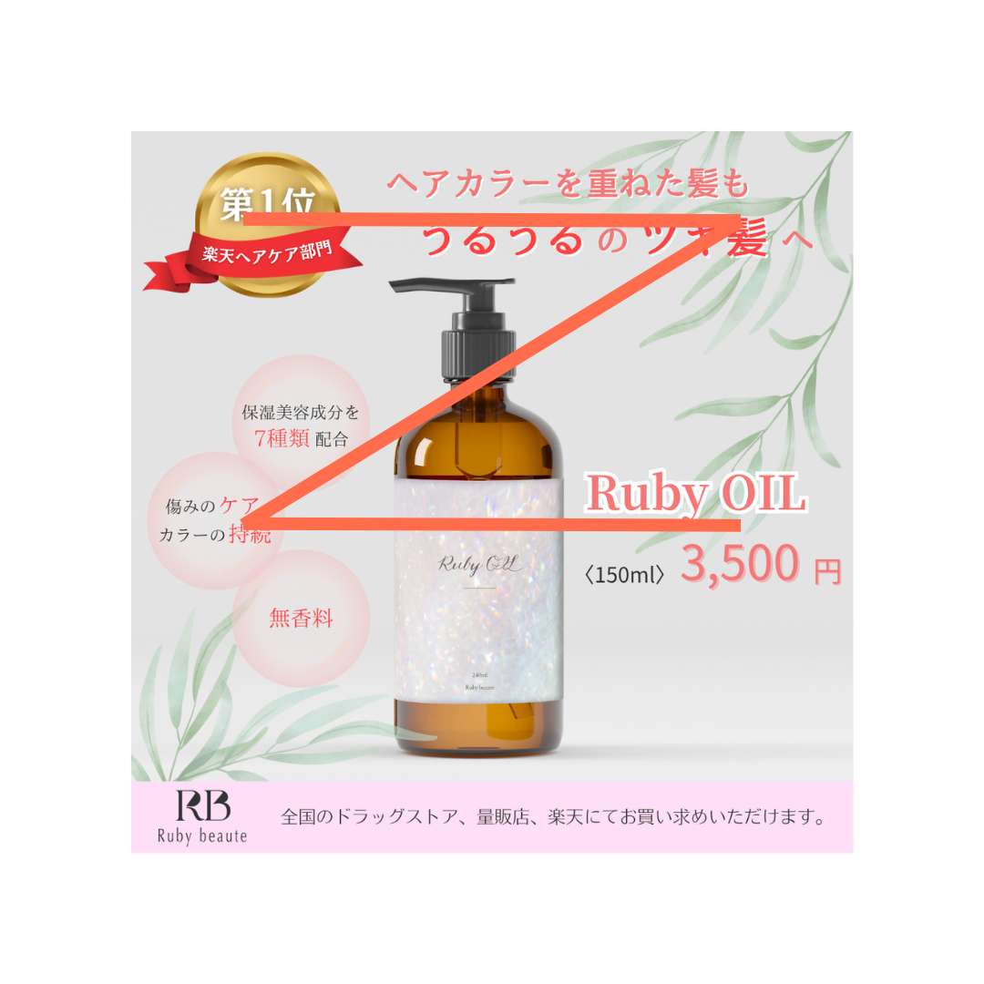 ② ヘアオイルの情報や特徴がわかりやすいように、あまり長い文章にせず、1つ1つを丸で囲い、まとめました。より伝えたい内容を文字を少し大きくして色も変えました。