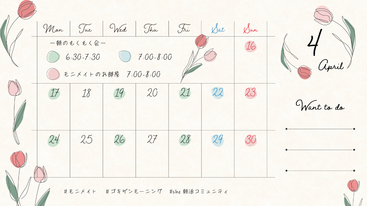 【実案件/カレンダー】SHElikes 8期朝活コミュニティ 4月後半カレンダー