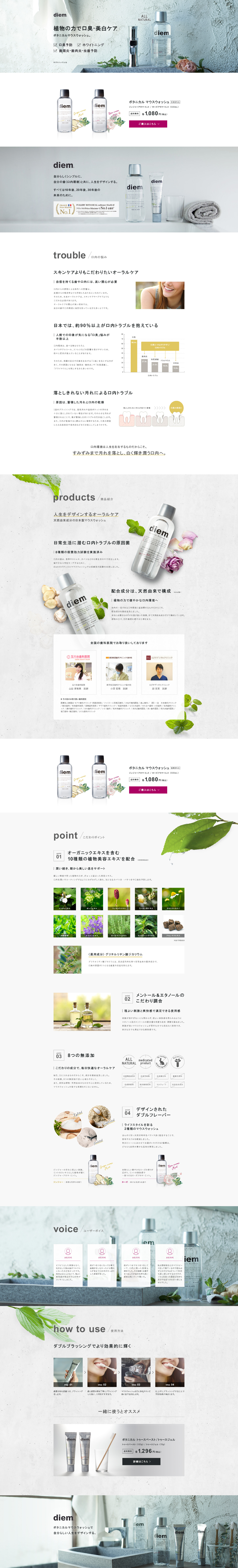 I-me 『diem』マウスウォッシュ LP 小畑 恵里 UIUXデザイナー・アートディレクター OVERVIEW ボタニストで有名なi-ne様の商品「diem」の商品リリース時に、楽天ショップページ用のLP作成を担当させていただきました。 YEAR 2017 :: 担当 ::LPデザイン