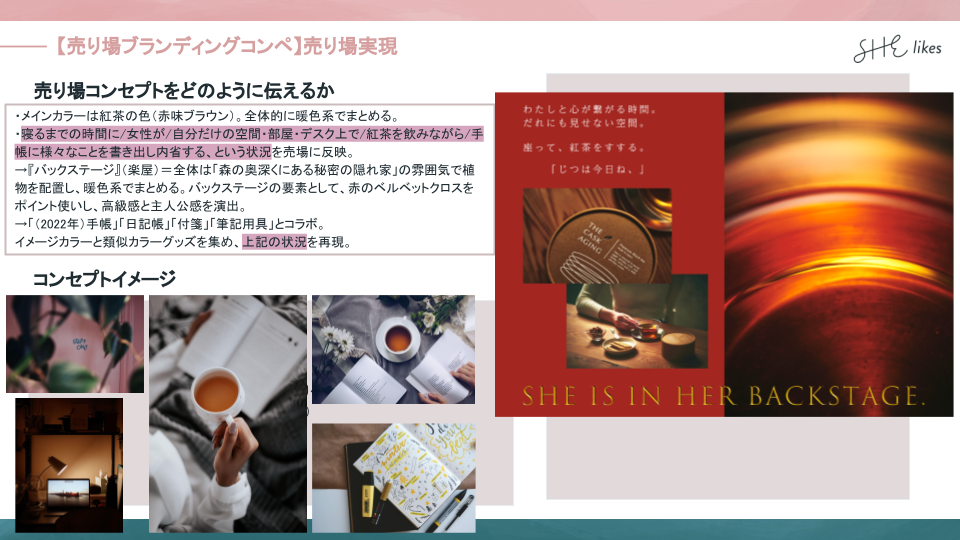 【「私だけの時間・空間=BACK STAGE」のコンセプト】と【プロモーション期間連動の売り場】をどのように違和感なく繋げ、且つまとまったものとしてブランディングするかの親和性やアイデアの引き出しが少なかったように思います。お客様にコンセプトだけでなく、手に取って頂きたい商品そのものの魅力が伝わるような売り場づくりを今後も研究していきたいと思いました。