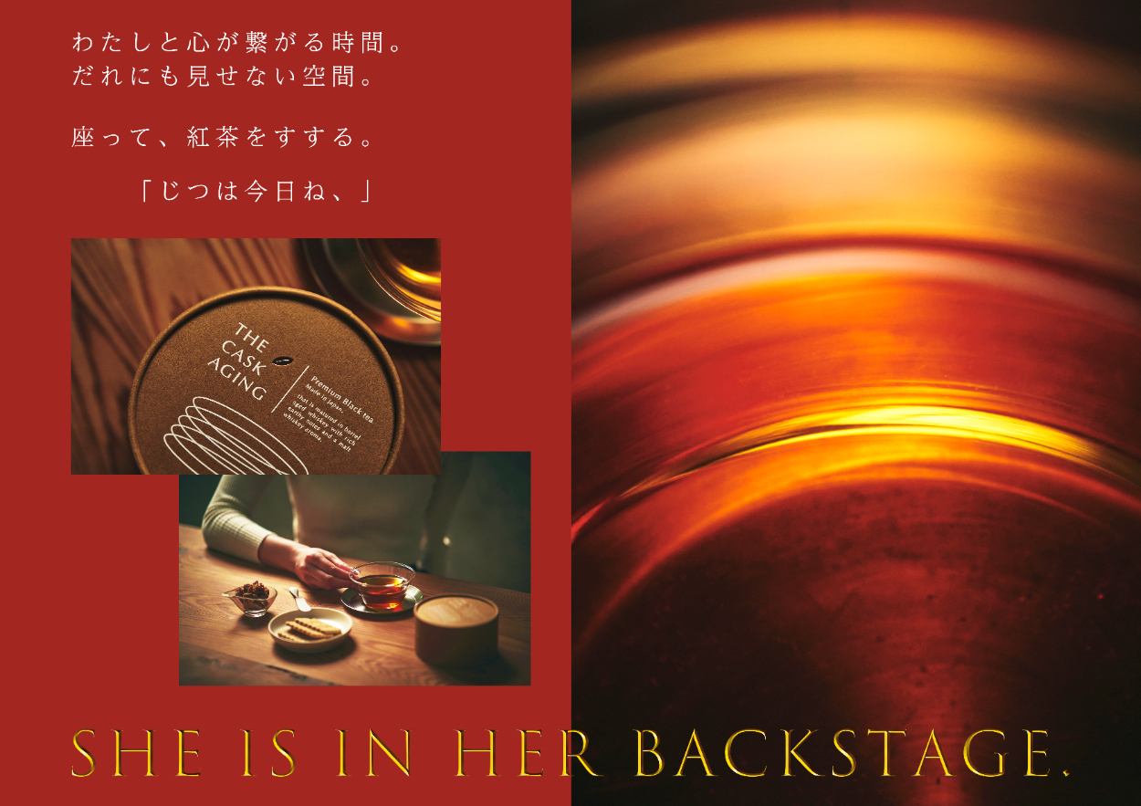 その上で、プレミアム国産紅茶「THE CASK AGING」が日常の中にある「特別な時間」を演出するものだと位置づけ、「私だけの時間・空間=BACK STAGE」としてコンセプト設定しました。