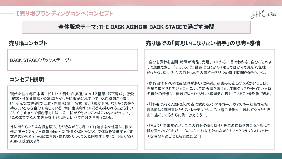 樽で熟成させたプレミアム紅茶「THE CASK AGING」のペルソナ設定・売り場ブランディング・売り場で展開するPOP制作を行いました。結果は【不採用】(応募58名のうち、2名採用)でしたが、採用作品との比較・分析をまとめました。(制作時間:24時間)