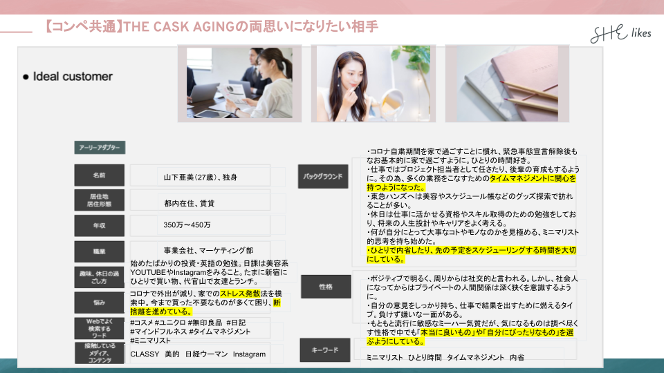 一方で、ペルソナの普段の行動や客観的に周りからどんな風に思われているのか・世間のトレンドで言うとどの要素を持っているのか(例:丁寧な暮らしを好む。韓国や淡色コーデが好き。など)といった外的要素も具体性を上げて組み込むことができれば、よりペルソナにアプローチできたブランディングに繋がったのではと思いました。
