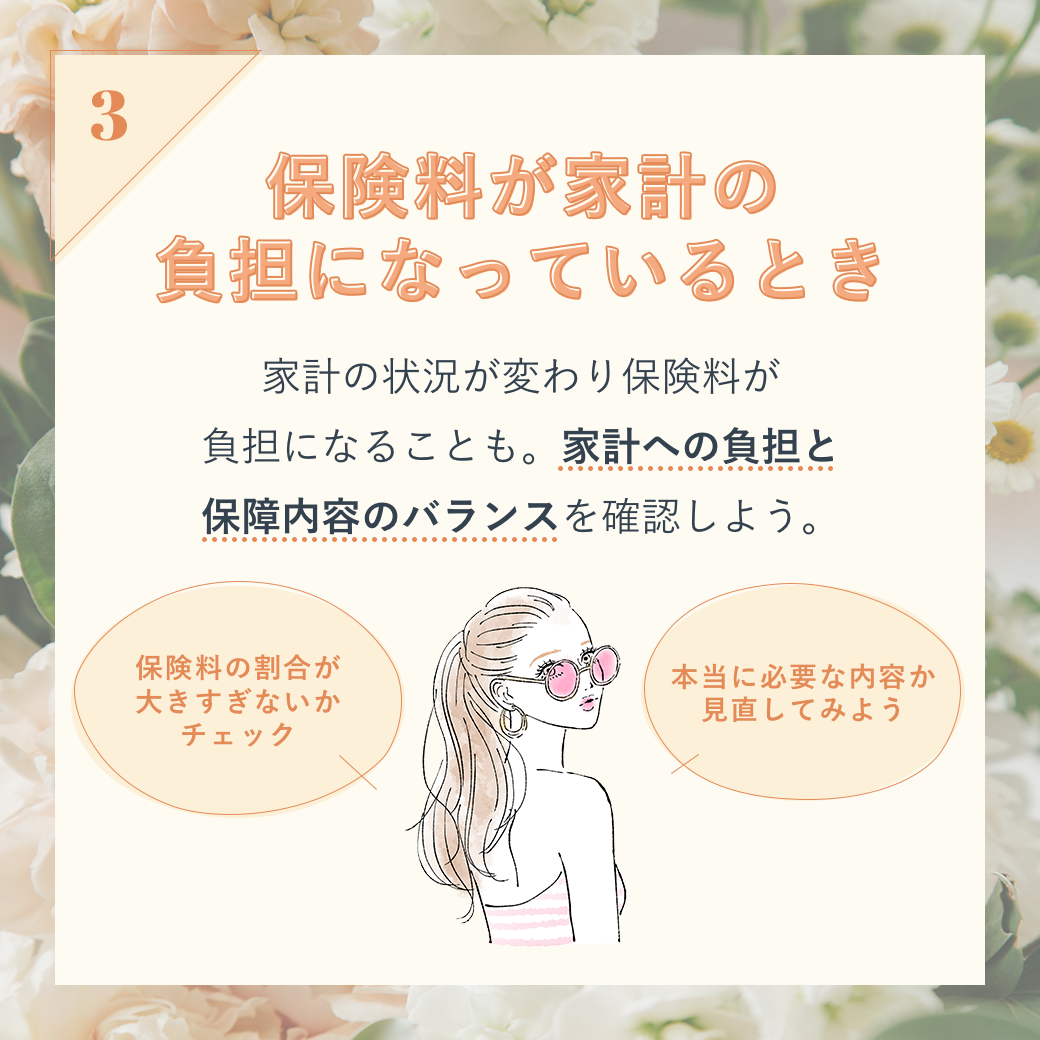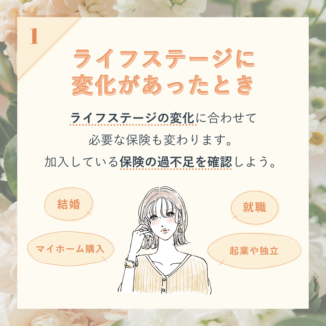 ・保険を見直すタイミングを伝えるだけでなく、女性のイラストからの吹き出しでヒントやTipsを提示して知識的価値をつけました。