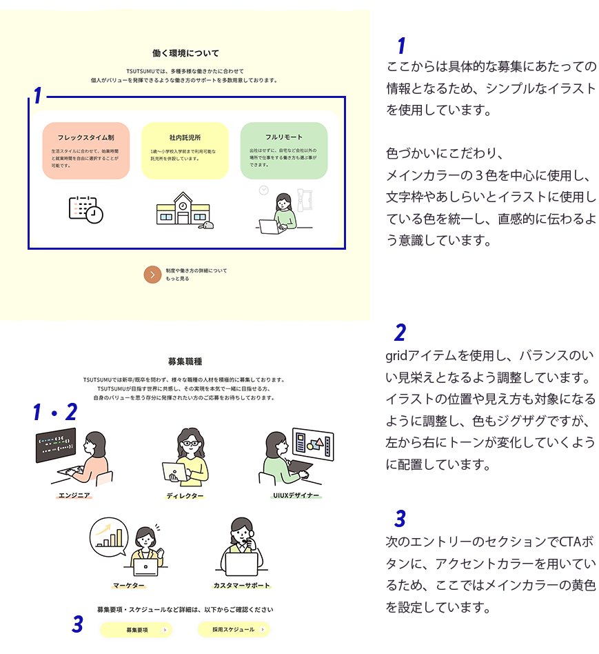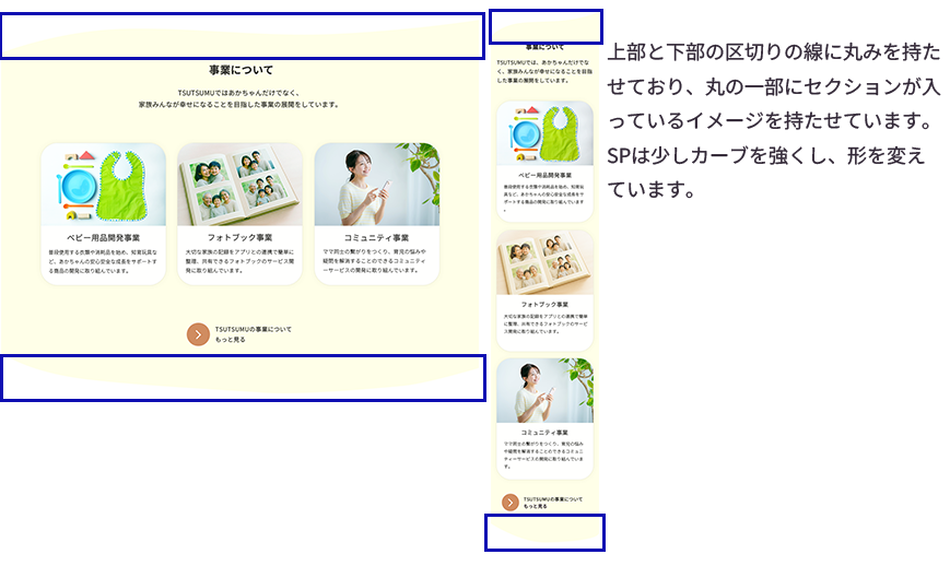 事業についてとエントリーのセクション間も、大きく見ると丸の形をとっているという趣旨で、丸みのある線で区切っています。