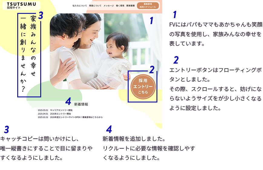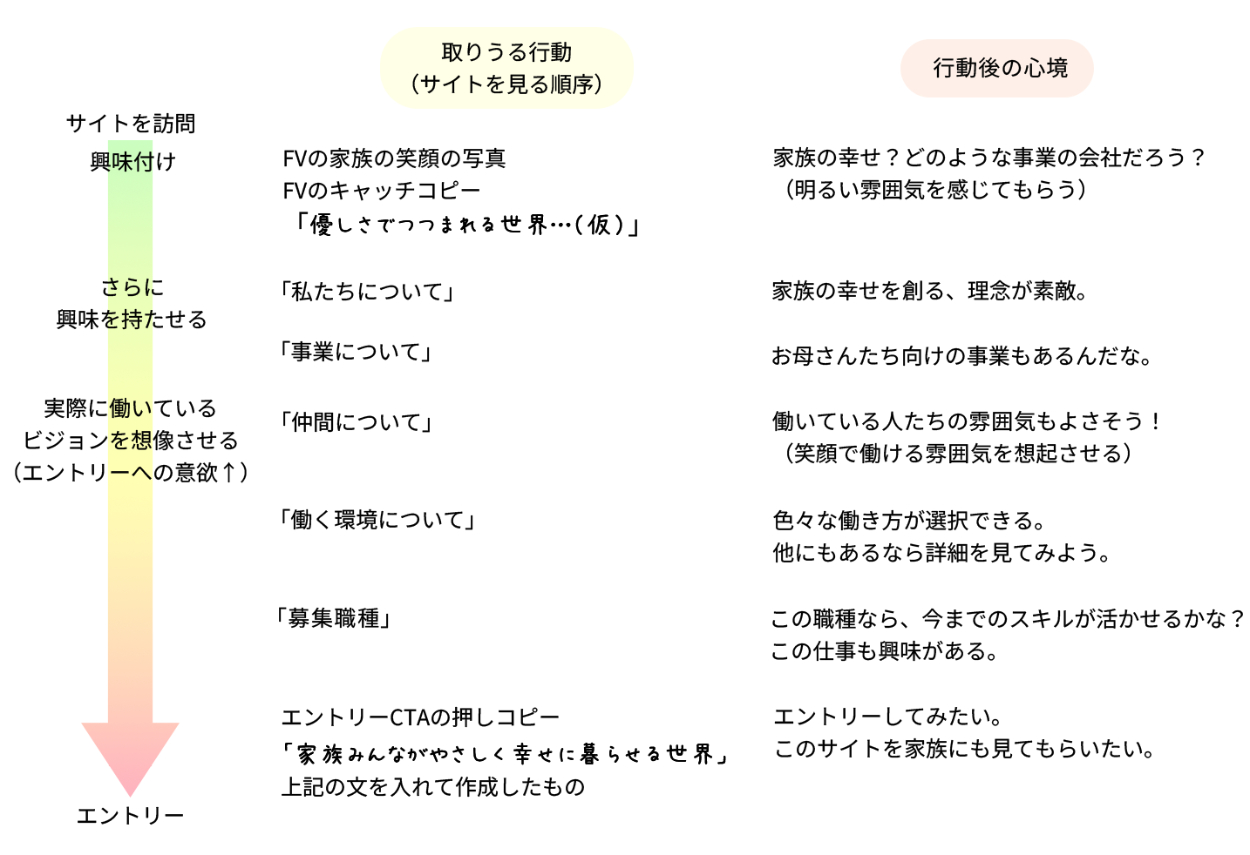 提示された要素にあったコンセプトより、「ママやパパだけでなく、おじいちゃんからおばあちゃんまで」という所に、今後は家族みんなの幸せを創る企業でありたいという強い願いを感じました。そこを前面に押し出し、共感を得られる人物の採用を目指す事を考えました。