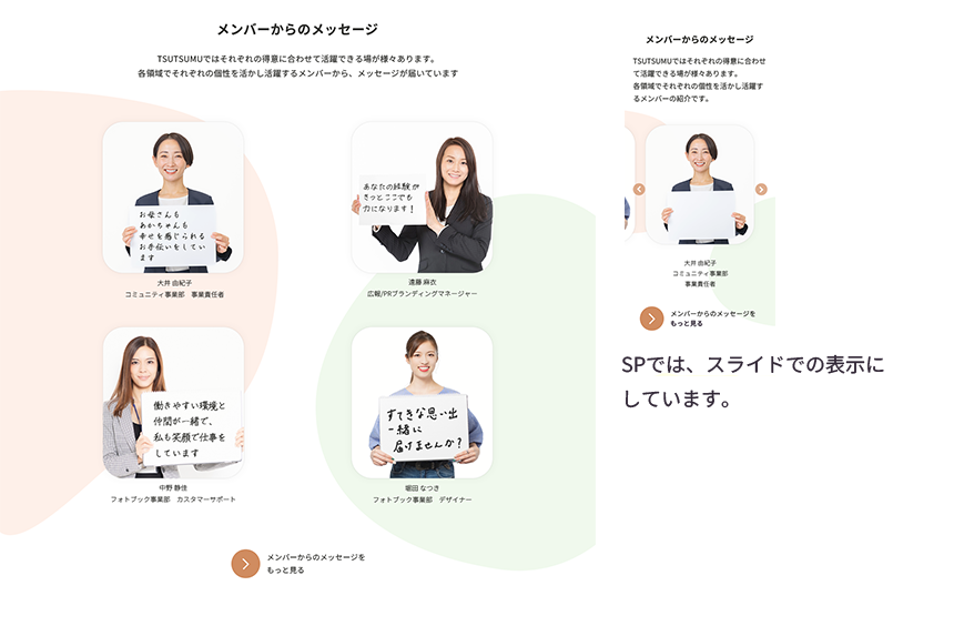 クライアントから提示された要素は「メンバー紹介」でしたが、「メンバーからのメッセージ」と変更することを提案します。実際のメンバーに手書きで書いたメッセージボードを持ってもらい、写真を撮る方法を想定しています。