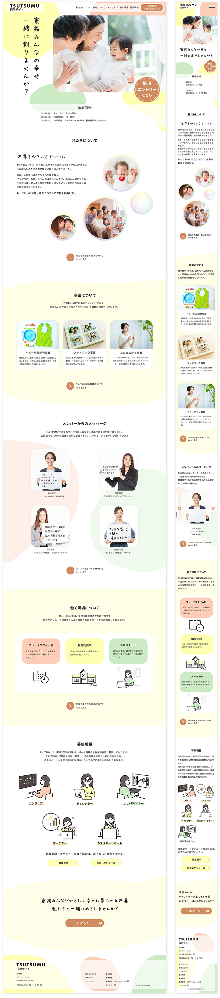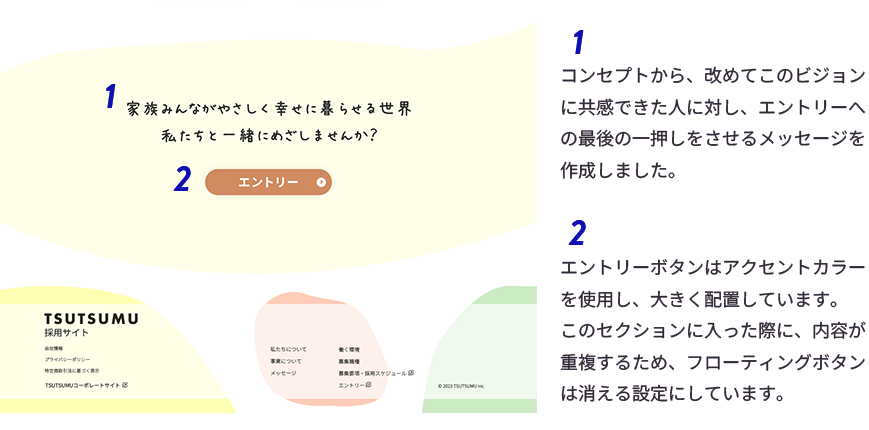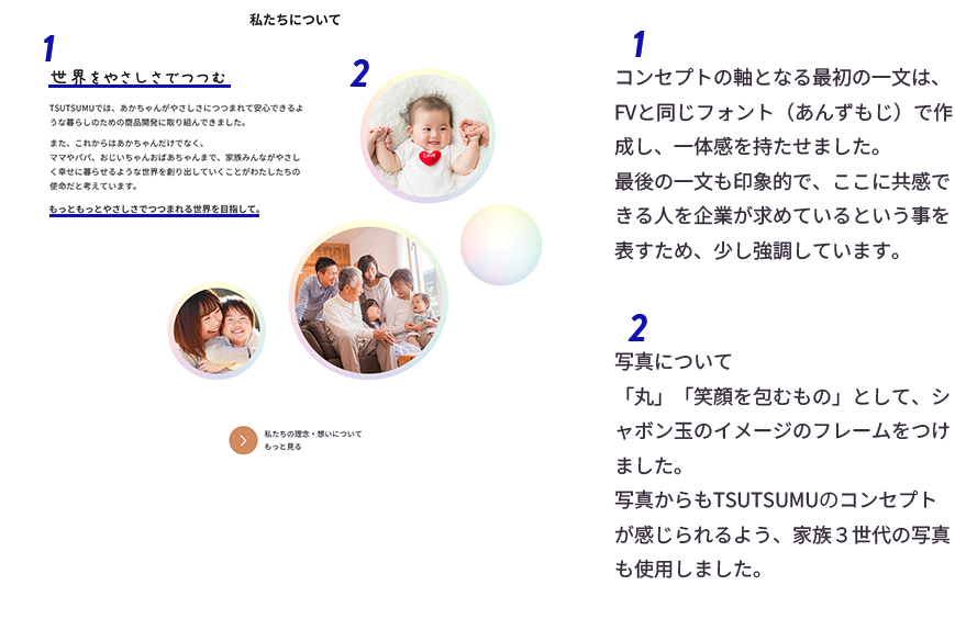 「TSUTSUMU」から、つつむ=角のない形、丸を想像しました。ただし、幸せの形は様々あるという意味合いも込め、あえて丸の形を崩したことで、それぞれの家族の形や幸せを創り上げるという所を表現しました。FVやメンバーからのメッセージ、フッターに使用しています。