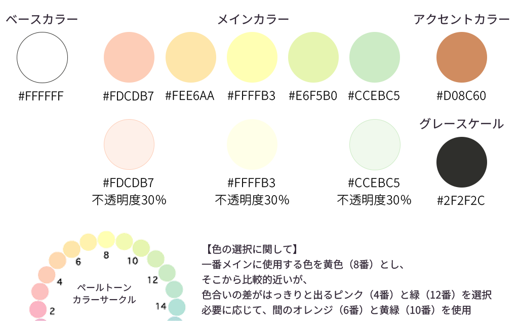 具体的には、やさしい雰囲気を出すため、ペールトーンを選択し、一番のメインカラーを未来や希望を表す黄色としました。さらに、平和や幸せを表す緑、やさしさを表すピンクを使用し、コンセプトを色でもできる限り表現できるようにしました。