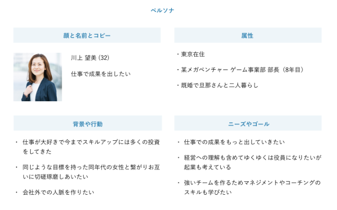 ☑ ペルソナのニーズ:キャリアアップをより目指していきたい。一人で黙々と取り組むよりも、近い目線のキャリア志向のある女性と繋がり、挑戦していきたい。