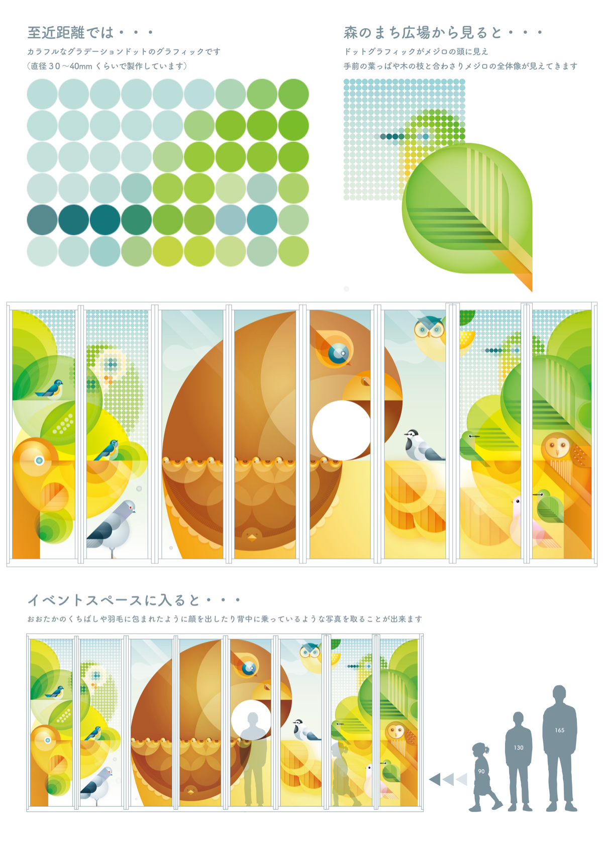 流山おおたかの森S・C FLAPS1F イベントスペースのガラス面を彩る空間グラフィックデザインを考え応募しました。