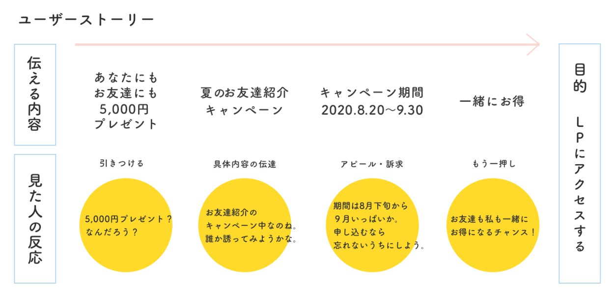 まずクライアントの設定したゴール(キャンペーンでの入会者を増やす)から、今回のバナーで達成する目的としては、「LPに遷移してもらうこと」と考えました。そして、ユーザーストーリーを検討し、入れて欲しい文言の中でどのような優先順位で目に留まらせるべきかを練りました。