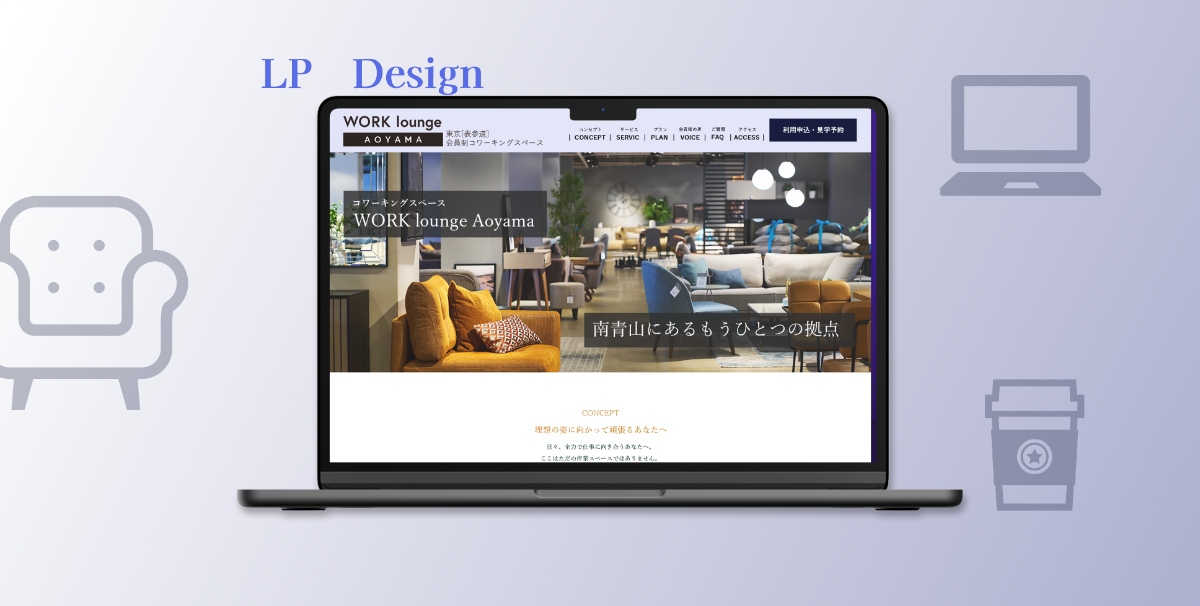 Work inc.様の新規会員獲得のためのLPサイトを制作しました。想定ペルソナが大切にしている「上質な環境」、興味がある「インテリア、デザイン」に着目し、高級感のある落ち着いた印象のサイト制作を目指しました。
