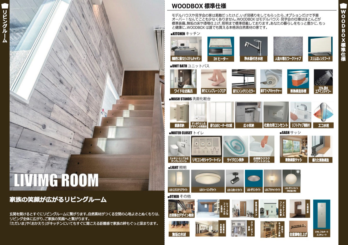 WOODBOXパンフレット3ページ目と8パージ目 福田 美穂 グラフィックデザイナー OVERVIEW 顧客への商品説明用のパンフレット制作 YEAR 2020 制作所要期間:1日業務内容:構成考案、デザイン使用ツール:Illustrator