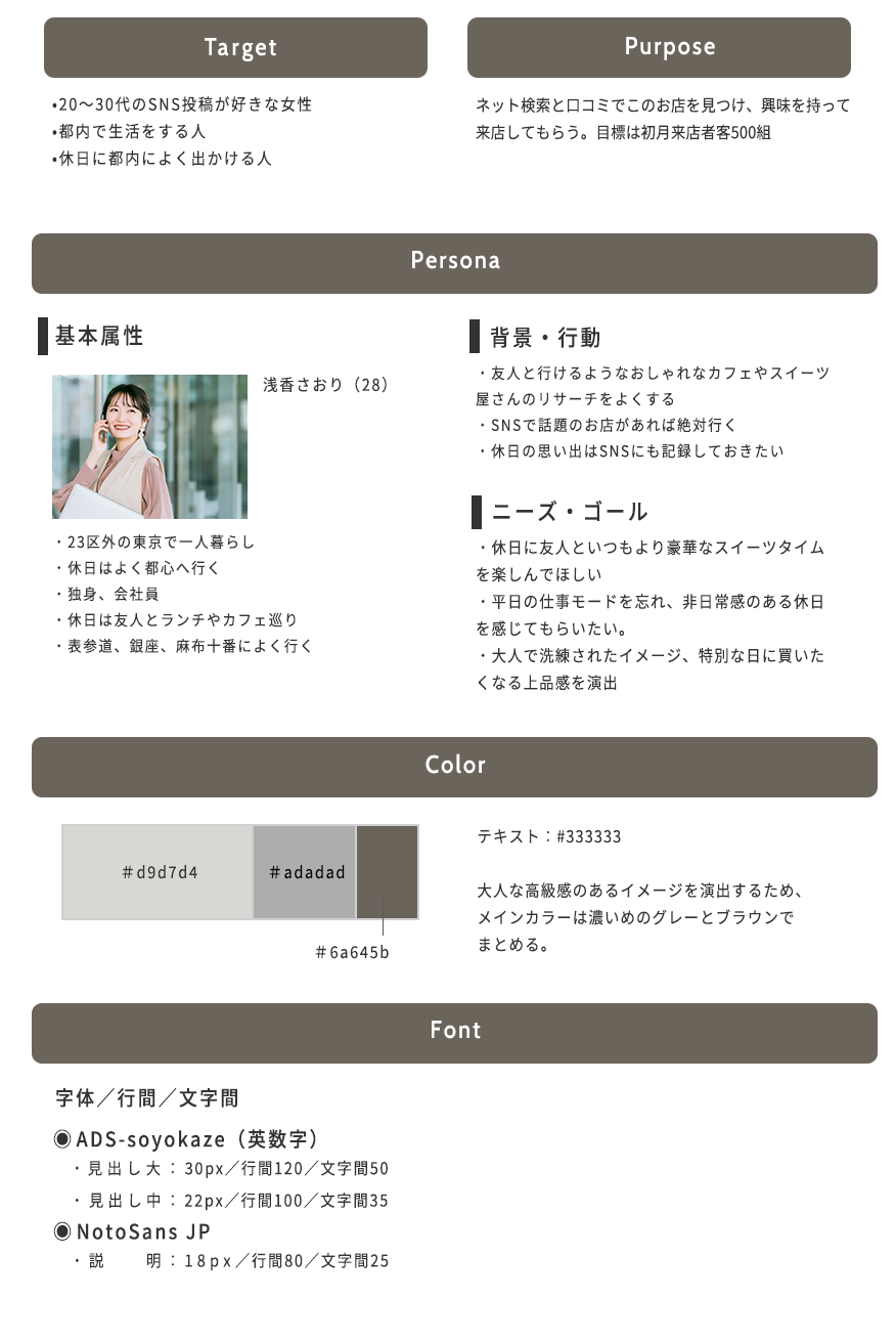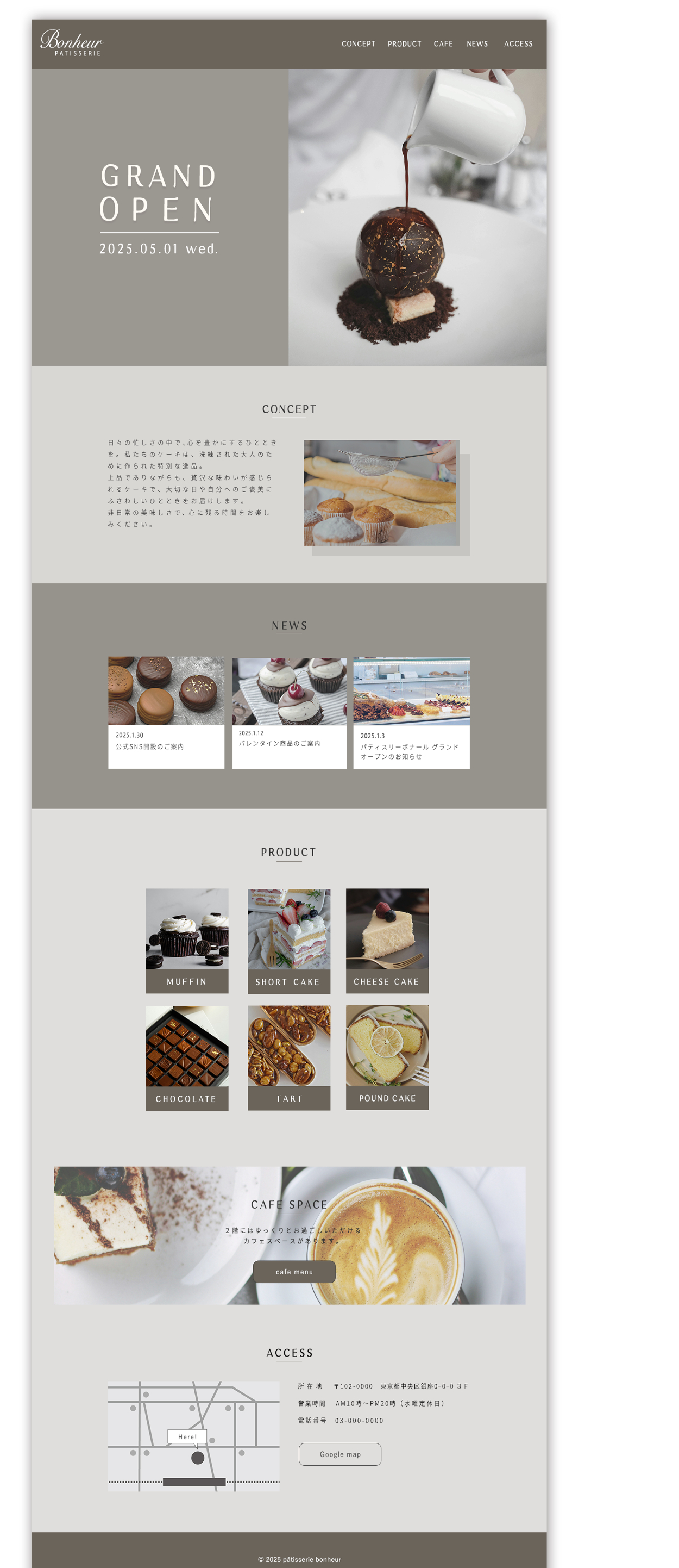 デザインスクールの課題にてパティスリーのHPを制作しました。 要件定義を元にした情報設計・ペルソナの設定・デザインカンプ作成・コーディングまで行いました。 [ 制作年:2025年2月 制作期間:1ヶ月 使用ツール:Photoshop / HTML&CSS]