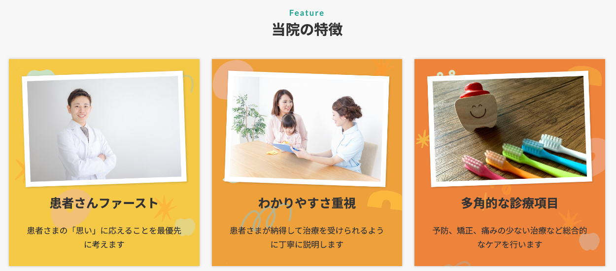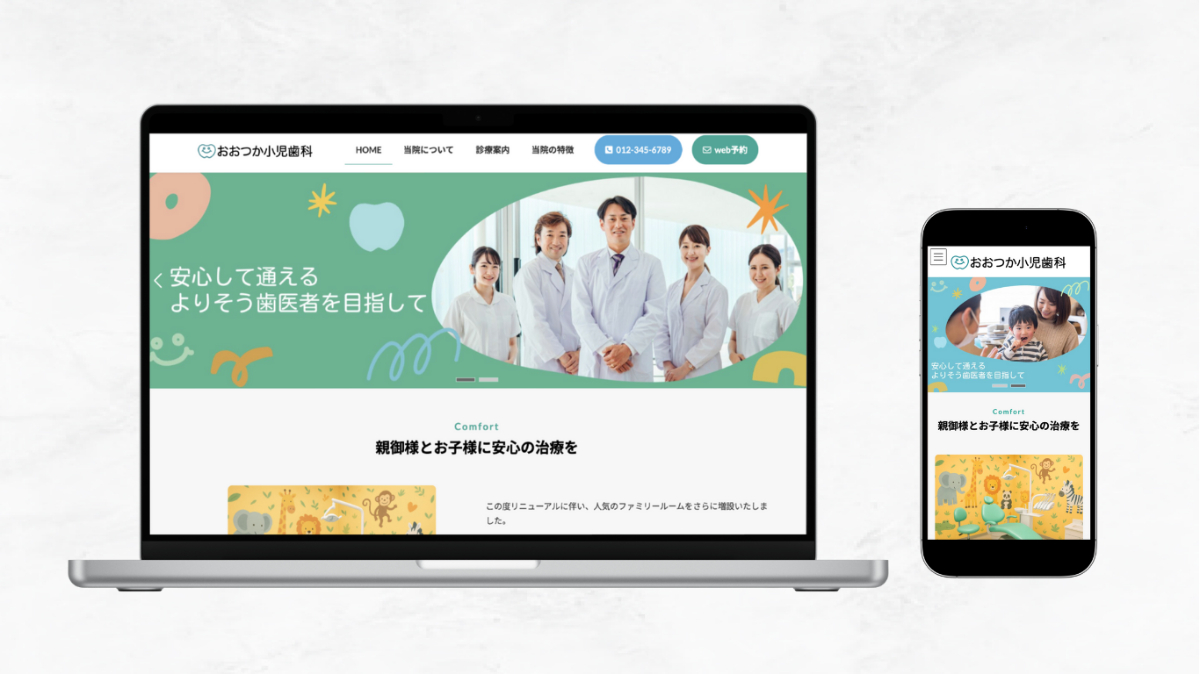 子供が安心して通える歯医者さんをコンセプトに、親しみやすいキャッチコピーと子供に好まれそうな楽しい雰囲気のデザインにしています。また診療するスタッフの写真や親子で診察を受けるをメインビジュアルに設定することで、安心できる雰囲気を伝えています。