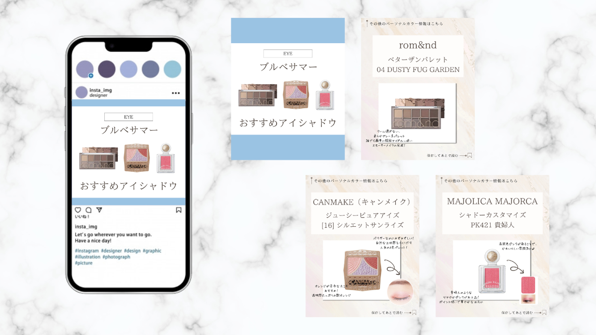 パーソナルカラーを診断できるサロン様の、公式Instagramの投稿制作をしました。 今回は、『おすすめコスメ』について紹介するため、商品のリサーチからライティングまで行い、デザインしました。