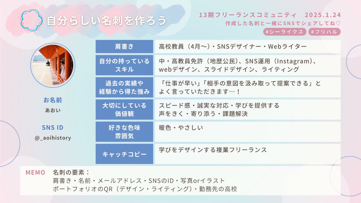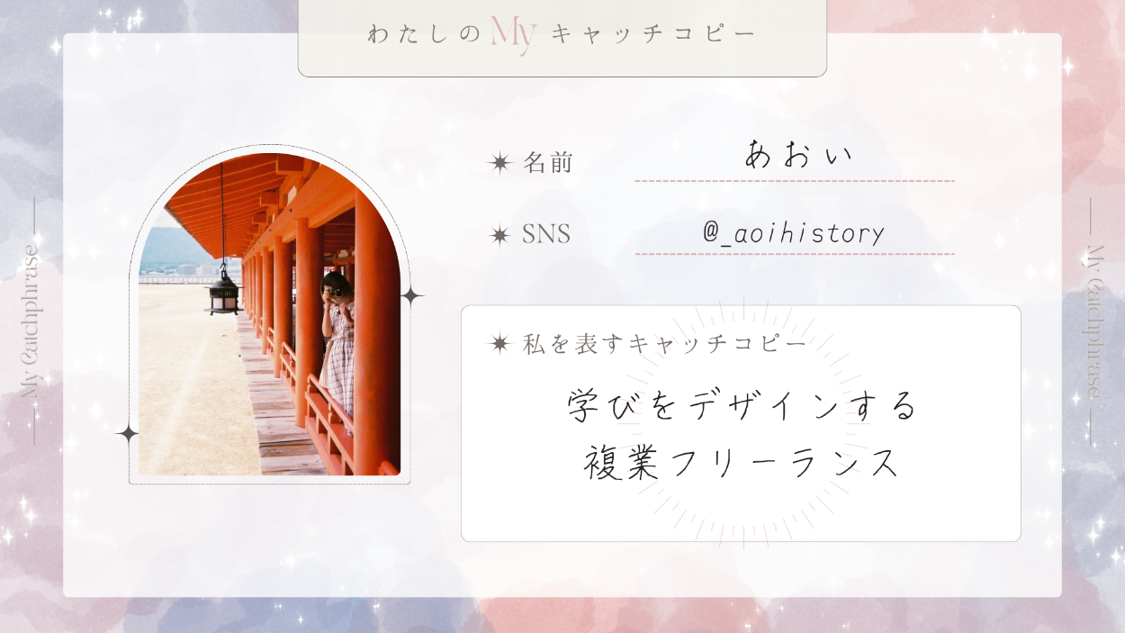 【自主制作】名刺作成 あおい 学びをデザインする複業フリーランス 自分自身の名刺を作成しました。名刺を作成するにあたり、コミュニティイベントで情報整理し、またキャッチコピーを作成しました。作成時間:2時間