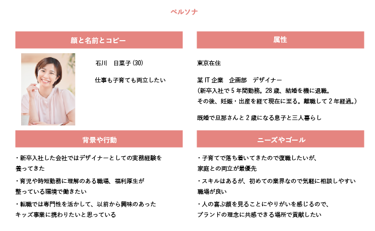ペルソナのニーズは、育児に理解ある環境かどうか・未経験業界への職場復帰で不安が払拭できるかどうかです。