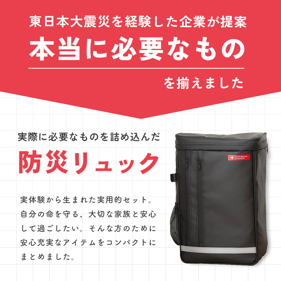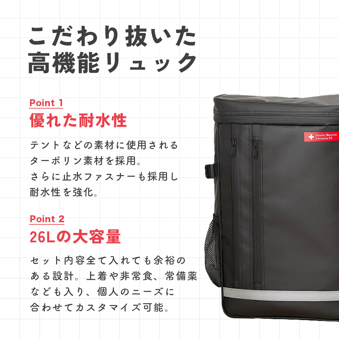 以上の分析結果をデザインに落とし込み、さらにターゲットに安心感と実用性を感じてもらうため、なぜこのセットが必要なのかの理由説明、セット内容の細分化、リュックの機能性などしっかり伝わるよう構成。