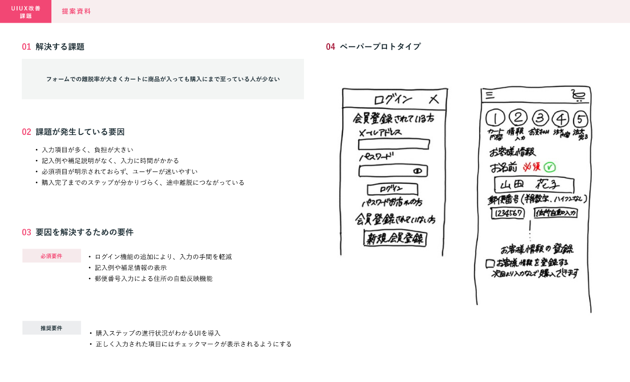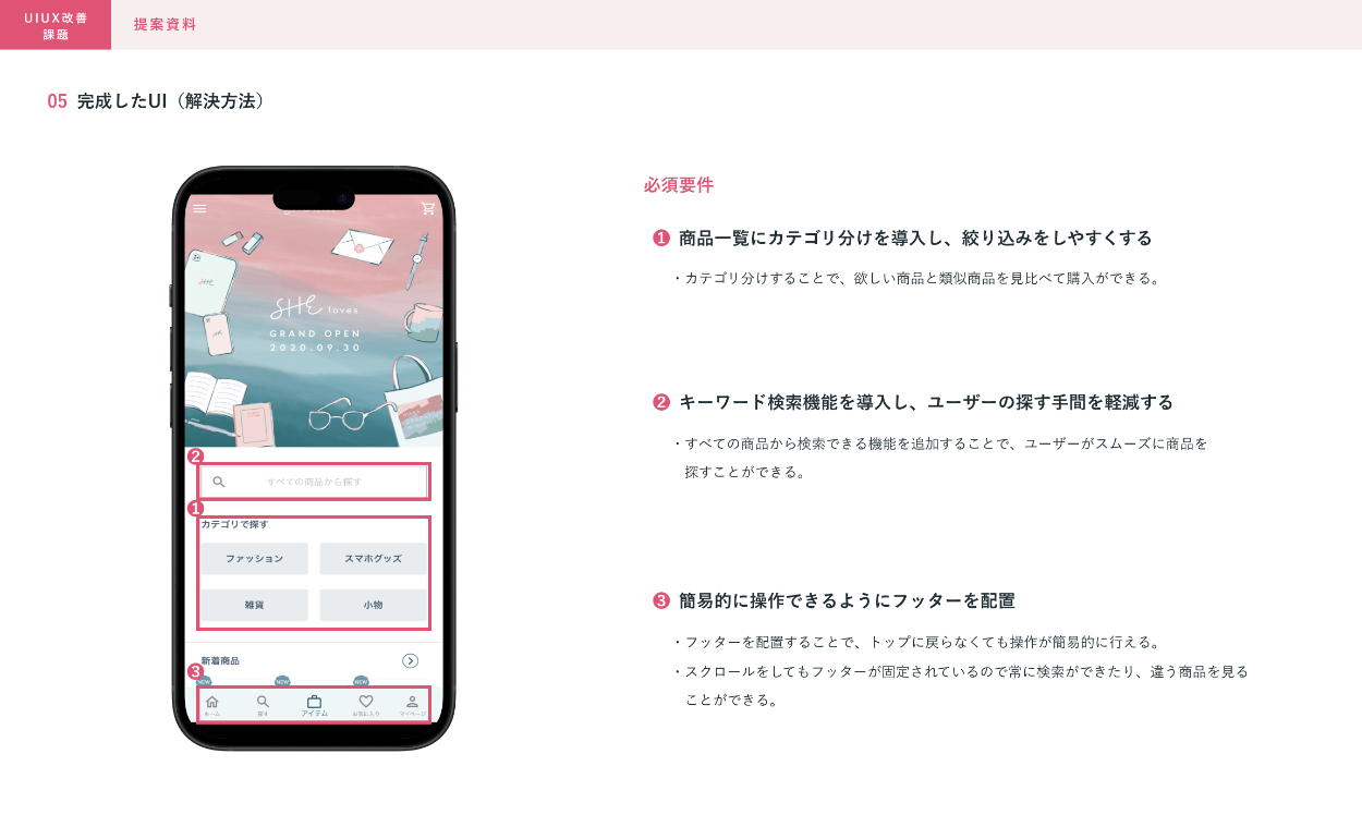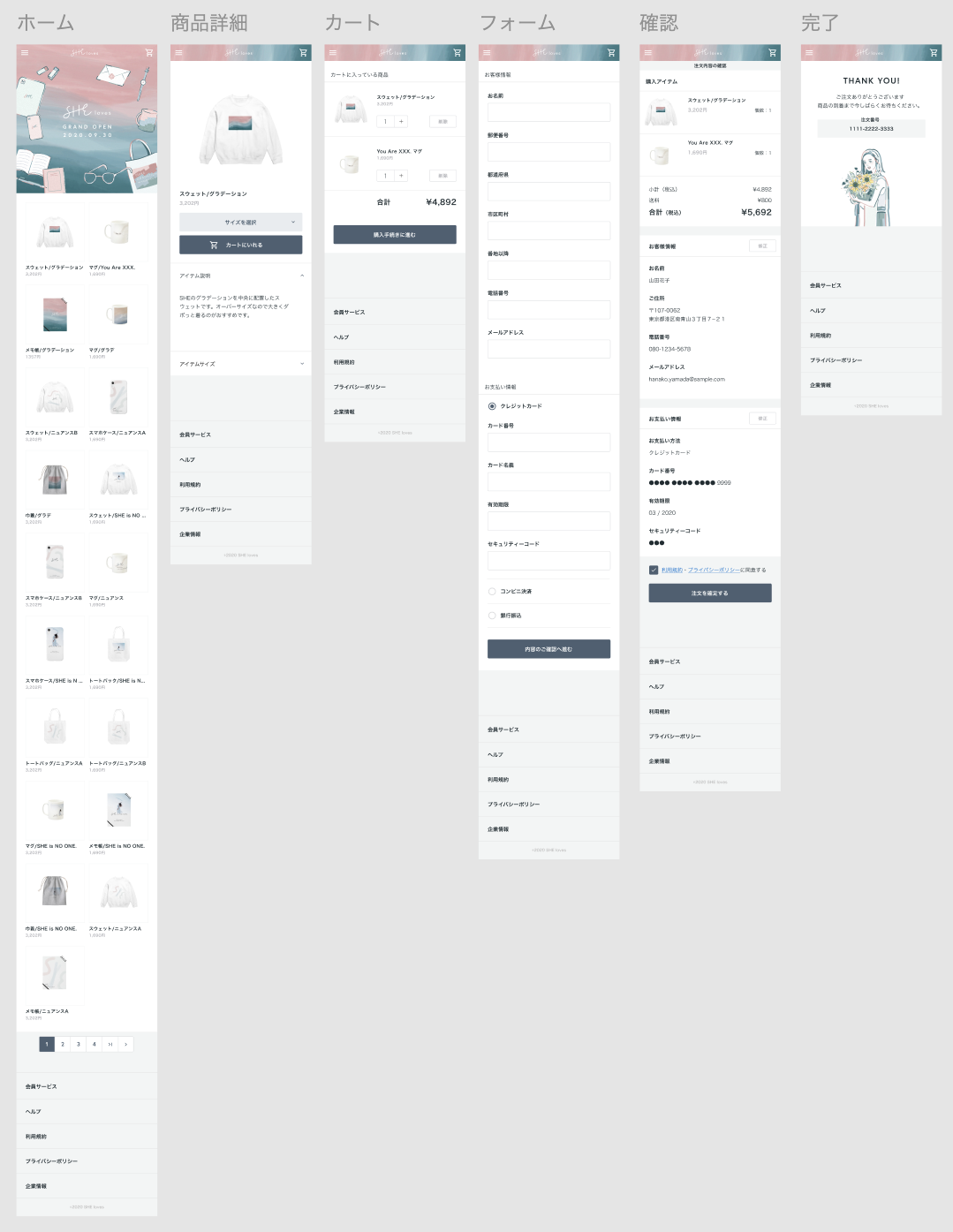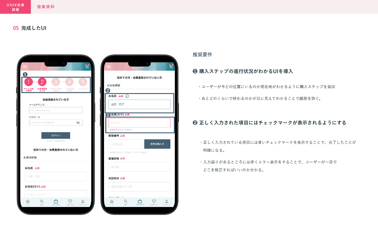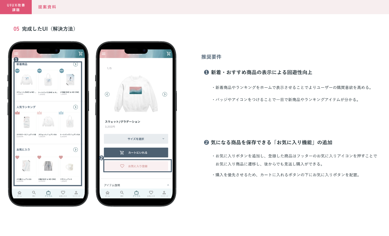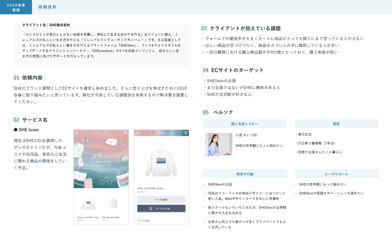 SHElikes MULTI CREATOR COURSE Designerの課題。架空クライアントECサイトのUI/UXのデザインカンプ、改善提案資料を作成しました。