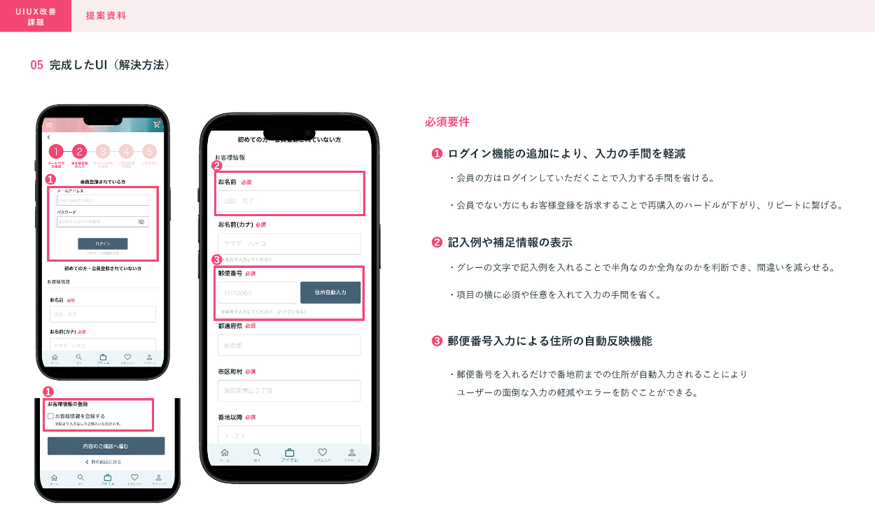 ユーザーの行動や思考の流れを考えながら、デザインに落とし込むことを大切にしました。実際に取り組む中で、UI/UX改善にはユーザー視点が欠かせないこと、