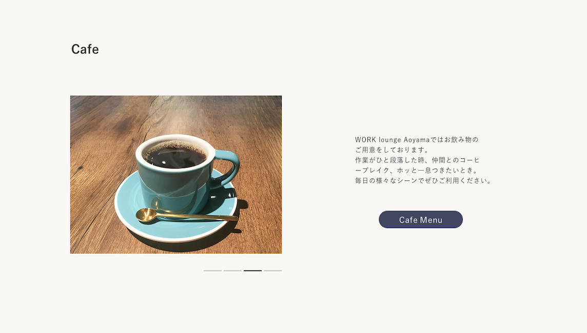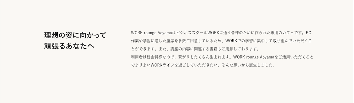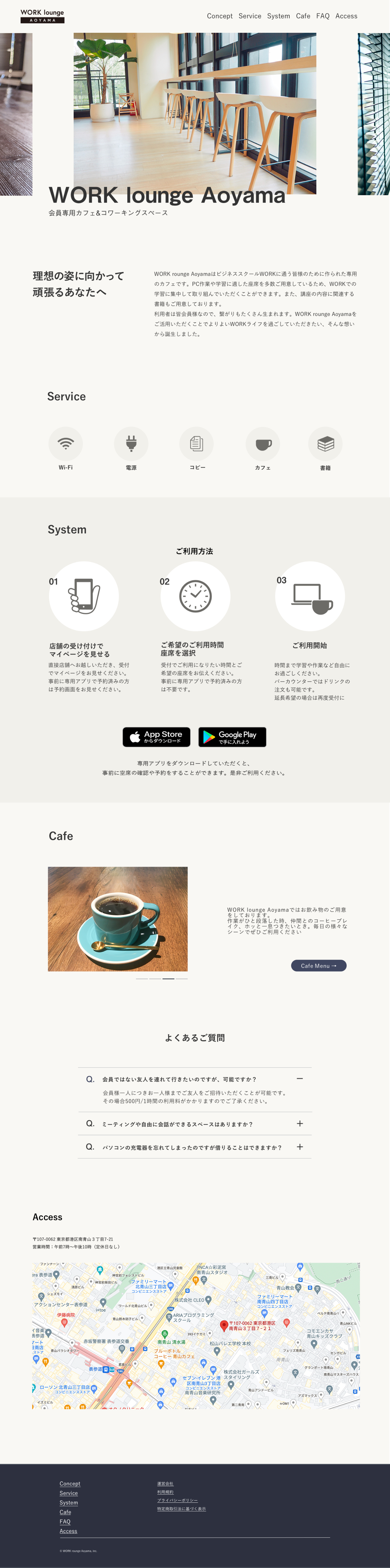 カフェ&コワーキングスペースのLPですが、この場所に来る方はビジネススクールの会員様がメインで主に勉強や作業をする目的が多いと思ったのでカフェメニューは詳しく載せずに気になる方だけが見るようなデザインにしました。